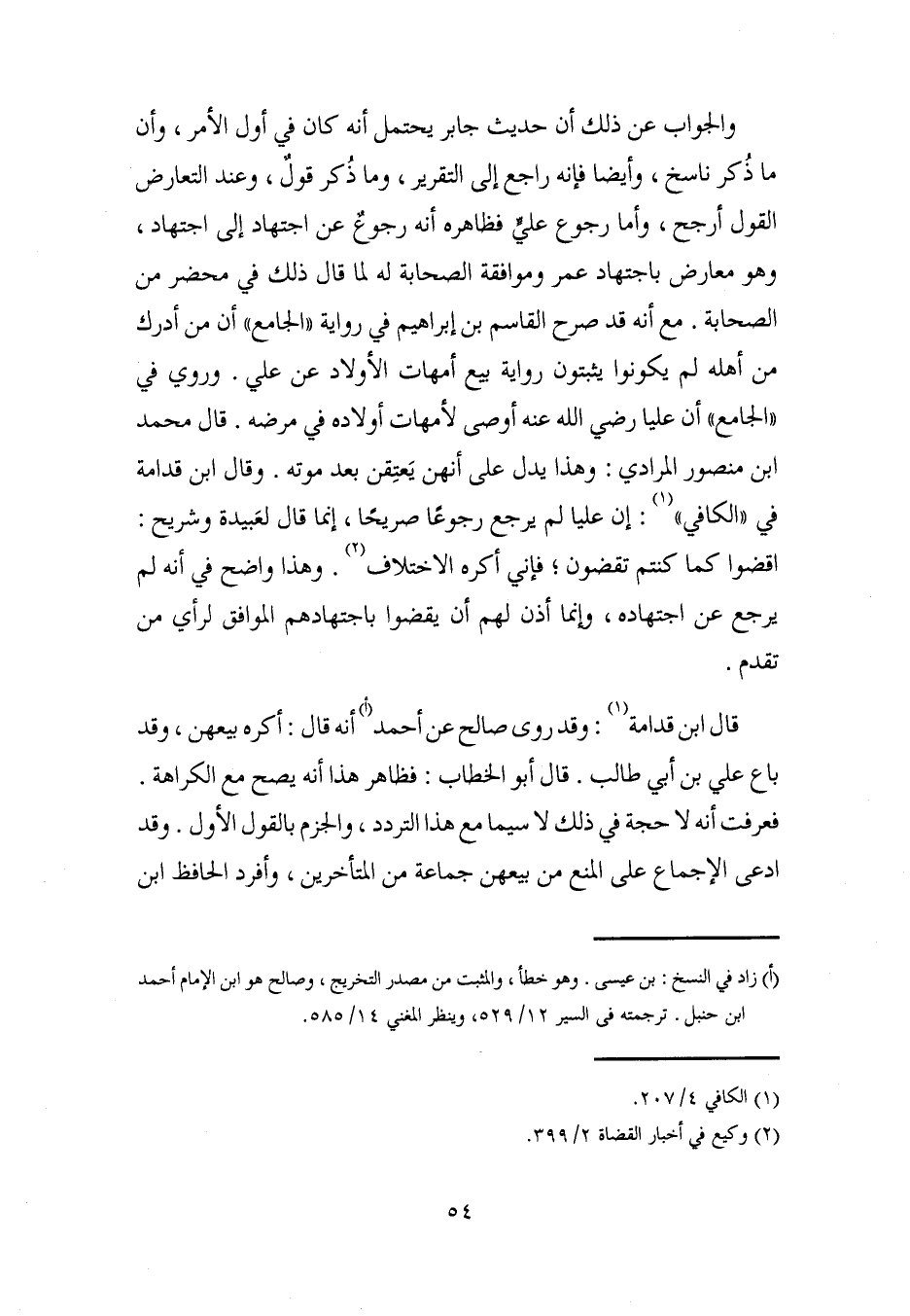 والجواب عن ذلك أن حديث جابر يحتمل أنه كان في أول الأمر، وأن ما ذُكر ناسخ، وأيضًا فإنه راجع إلى التقرير، وما ذُكر قولٌ، وعند التعارض القول أرجح، وأما رجوع علي فظاهره أنه رجوعٌ عن اجتهاد إلى اجتهاد، وهو معارض باجتهاد عمر وموافقة الصحابة له لما قال ذلك في محضر من الصحابة. مع أنه قد صرح القاسم بن إبراهيم في رواية "الجامع" أن من أدرك من أهله يكونوا يثبتون رواية بيع أمهات الأولاد عن علي. وروي في "الجامع" أن عليا رضي الله عنه أوصى لأمهات أولاده في مرضه. قال محمد بن منصور المرادي: وهذا يدل على أنهن يَعتِقن بعد موته. وقال ابن قدامة في "الكافي" (¬1): إن عليا لم يرجع رجوعًا صريحًا، إنما قال لعَبيدة وشريح: اقضوا كما كنتم تقضون؛ فإني أكره الاختلاف (¬2). وهذا واضح في أنه لم يرجع عن اجتهاده، وإنما أذن لهم أن يقضوا باجتهادهم الموافق لرأي من تقدم.
