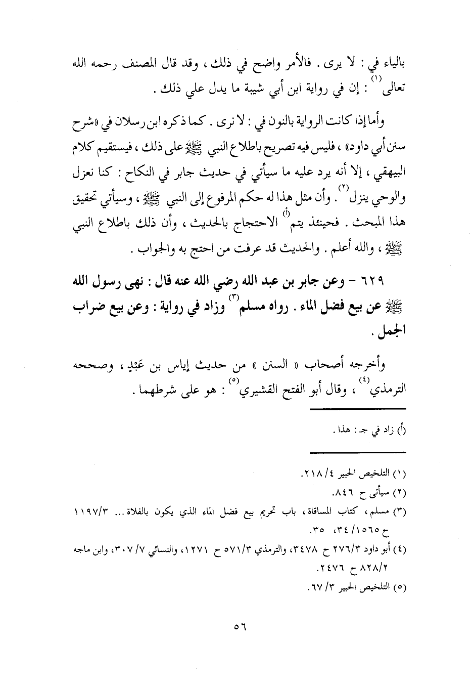 629 - وعن جابر بن عبد الله رضي الله عنه قال: نهى رسول الله - صلى الله عليه وسلم - عن بيع فضل الماء. رواه مسلم (¬3) وزاد في رواية: وعن بيع ضراب الجمل.