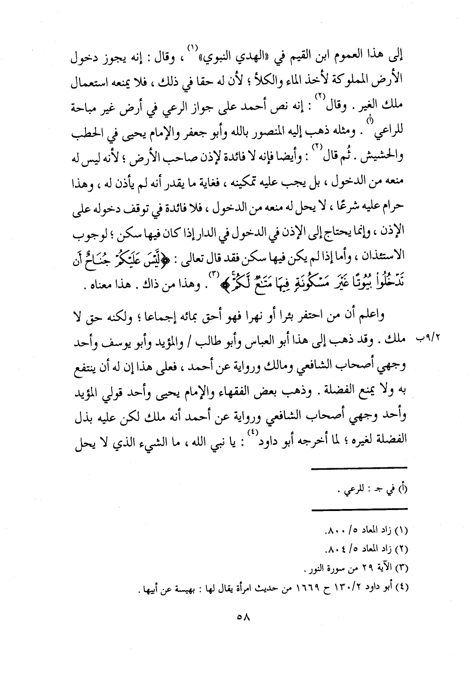 إلى هذا العموم ابن القيم في "الهدي النبوي" (¬1)، وقال: إنه يجوز دخول الأرض المملوكة لأخذ الماء والكلأ؛ لأن له حقا في ذلك، فلا يمنعه استعمال ملك الغير. وقال (¬2): إنه نص أحمد على جواز الرعي في أرض غير مباحة للراعي (أ). ومثله ذهب إليه المنصور بالله وأبو جعفر والإمام يحيى في الحطب والحشيش. ثُم قال (2): وأيضًا فإنه لا فائدة لإذن صاحب الأرض؛ لأنه ليس له منعه من الدخول، بل يجب عليه تمكينه، فغاية ما يقدر أنه لم يأذن له، وهذا حرام عليه شرعًا، لا يحل له منعه من الدخول، فلا فائدة في توقف دخوله على الإذن، وإنما يحتاج إلى الإذن في الدخول في الدار إذا كان فيها سكن؛ لوجوب الاستئذان، وأما إذا لم يكن فيها سكن فقد قال تعالى: {لَيْسَ عَلَيْكُمْ جُنَاحٌ أَنْ تَدْخُلُوا بُيُوتًا غَيْرَ مَسْكُونَةٍ فِيهَا مَتَاعٌ لَكُمْ} (¬3). وهذا من ذاك. هذا معناه.