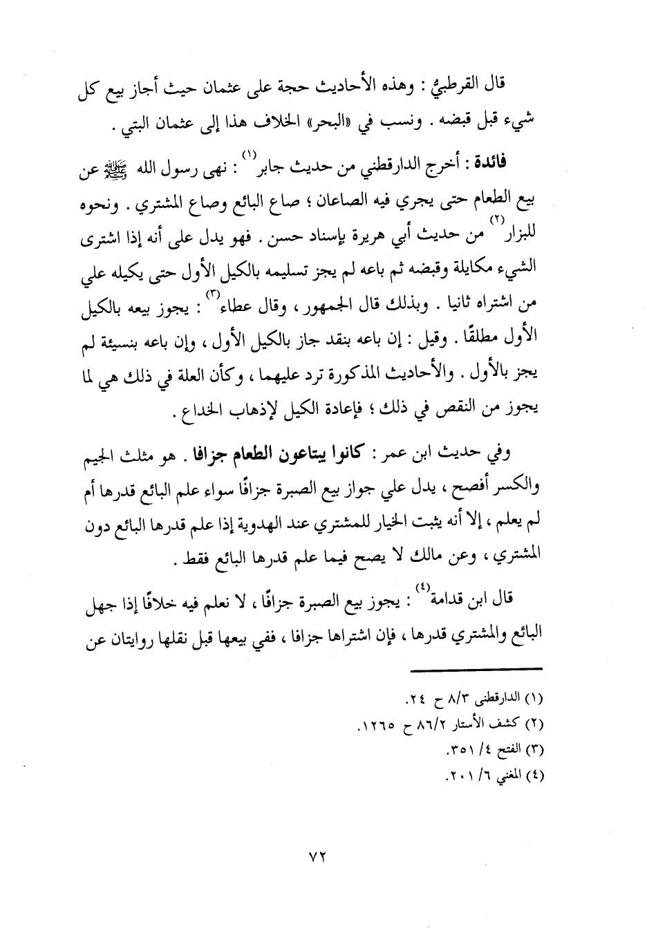 وفي حديث ابن عمر: كانوا يبتاعون الطعام جزافا. هو مثلث الجيم والكسر أفصح، يدل على جواز بيع الصبرة جزافًا سواء علم البائع قدرها أم لم يعلم، إلا أنه يثبت الخيار للمشتري عند الهدوية إذا علم قدرها البائع دون المشتري، وعن مالك لا يصح فيما علم قدرها البائع فقط.