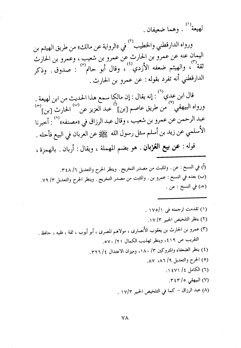 قال ابن عدي (¬6): إنه يقال: إن مالكا سمع هذا الحديث من ابن لهيعة. ورواه البيهقي (¬7) من طريق عاصم [بن] (أ) عبد العزيز عن (ب) الحارث [بن] (جـ) عبد الرحمن عن عمرو بن شعيب، وقال عبد الرزاق في "مصنفه" (¬8): أخبرنا الأسلمي عن زيد بن أسلم سئل رسول الله - صلى الله عليه وسلم - عن العربان في البيع فأحله.