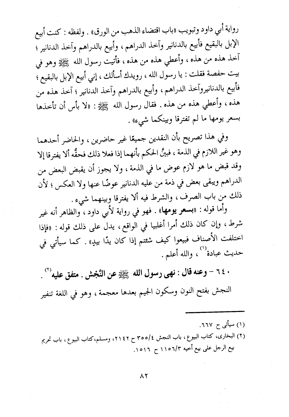رواية أبي داود وتبويب "باب اقتضاء الذهب من الورق". ولفظه: كنت أبيع الإبل بالبقيع فأبيع بالدنانير وآخذ الدراهم، وأبيع بالدراهم وآخذ الدنانير؛ آخذ هذه من هذه، وأعطي هذه من هذه، فأتيت رسول الله - صلى الله عليه وسلم - وهو في بيت حفصة فقلت: يا رسول الله، رويدك أسألك، إني أبيع الإبل بالبقيع؛ فأبيع بالدنانير وآخذ الدراهم، وأبيع بالدراهم وآخذ الدنانير؛ آخذ هذه من هذه، وأعطي هذه من هذه. فقال رسول الله - صلى الله عليه وسلم -: "لا بأس أن تأخذها بسعر يومها ما لم تفترقا وبينكما شيء".