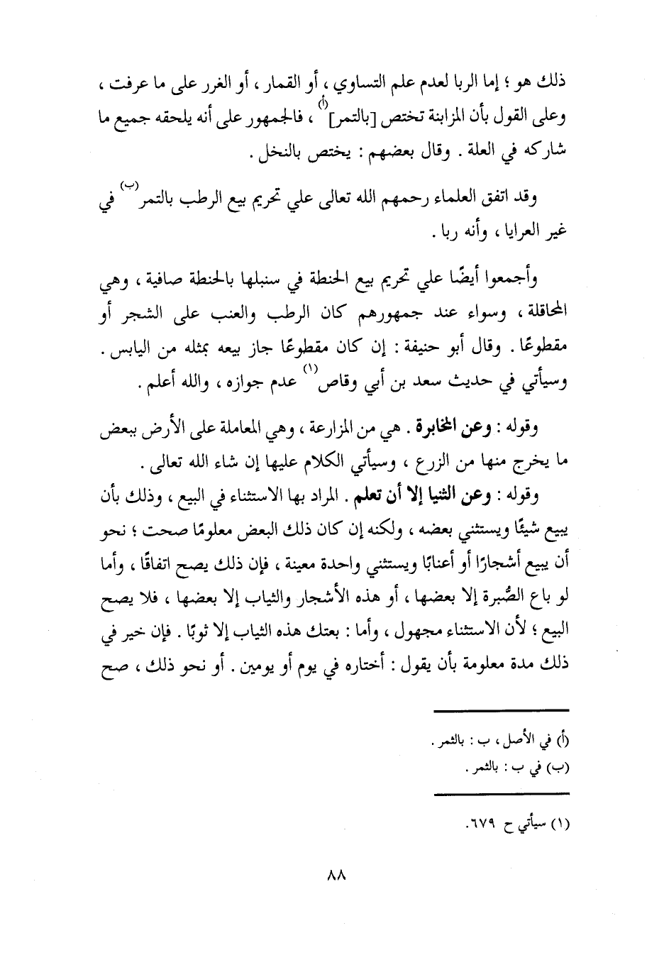 وقد اتفق العلماء رحمهم الله تعالى علي تحريم بيع الرطب بالتمر (ب) في غير العرايا، وأنه ربا.