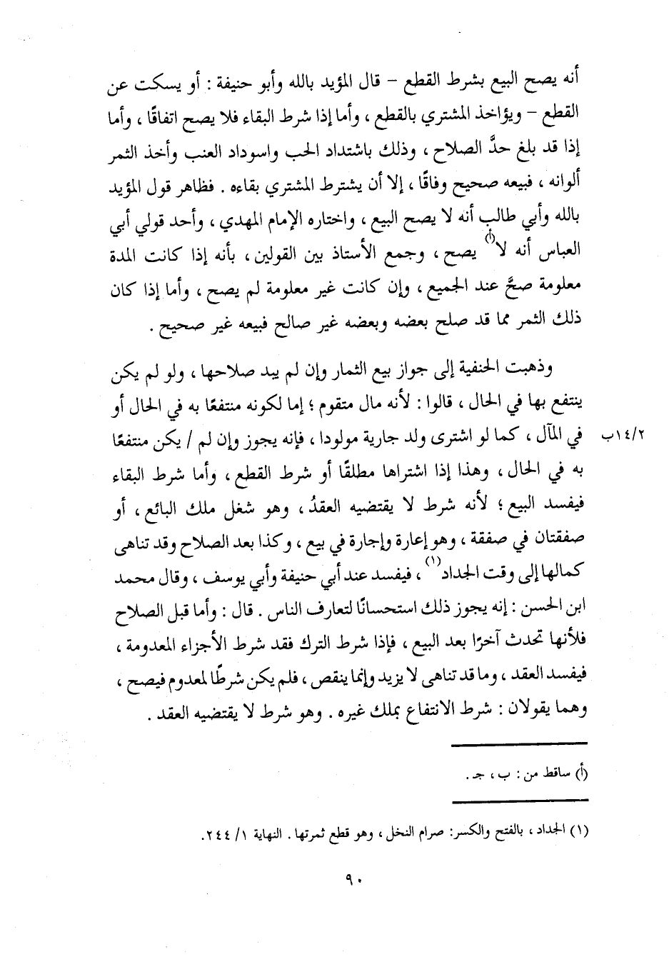 وذهبت الحنفية إلى جواز بيع الثمار وإن لم يبد صلاحها، ولو لم يكن ينتفع بها في الحال، قالوا: لأنه مال متقوم؛ إما لكونه منتفعًا به في الحال أو في المال، كما لو اشترى ولد جارية مولودا، فإنه يجوز كان لم يكن منتفعًا به في الحال، وهذا إذا اشتراها مطلقًا أو شرط القطع، وأما شرط البقاء فيفسد البيع؛ لأنه شرط لا يقتضيه العقدُ، وهو شغل ملك البائع، أو صفقتان في صفقة، وهو إعارة وإجارة في بيع، وكذا بعد الصلاح وقد تناهى كمالها إلى وقت الجداد (¬1)، فيفسد عند أبي حنيفة وأبي يوسف، وقال محمد بن الحسن: إنه جوز ذلك استحسانًا لتعارف الناس. قال: وأما قبل الصلاح فلأنها تحدث آخرًا بعد البيع، فإذا شرط الترك فقد شرط الأجزاء المعدومة، فيفسد العقد، وما قد تناهى لا يزيد وإنما ينقص، فلم يكن شرطًا لمعدوم فيصح، وهما يقولان: شرط الانتفاع بملك غيره. وهو شرط لا يقتضيه العقد.
