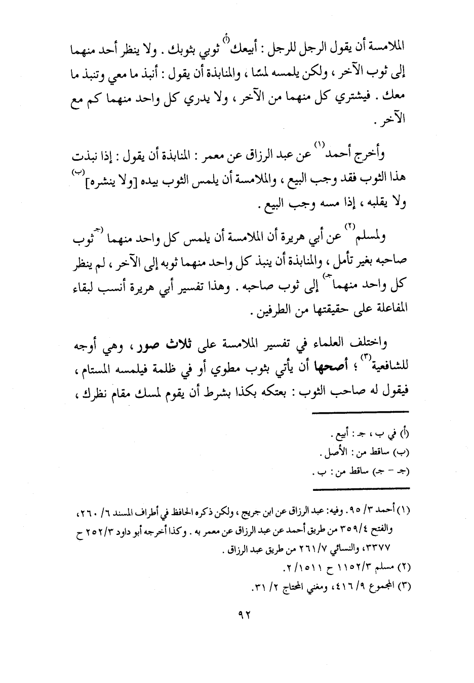 ولمسلم (¬2) عن أبي هريرة أن الملامسة أن يلمس كل واحد منهما (جـ ثوب صاحبه بغير تأمل، والمنابذة أن ينبذ كل واحد منهما ثوبه إلى الآخر، لم ينظر كل واحد منهما جـ) إلى ثوب صاحبه. وهذا تفسير أبي هريرة أنسب لبقاء المفاعلة على حقيقتها من الطرفين.