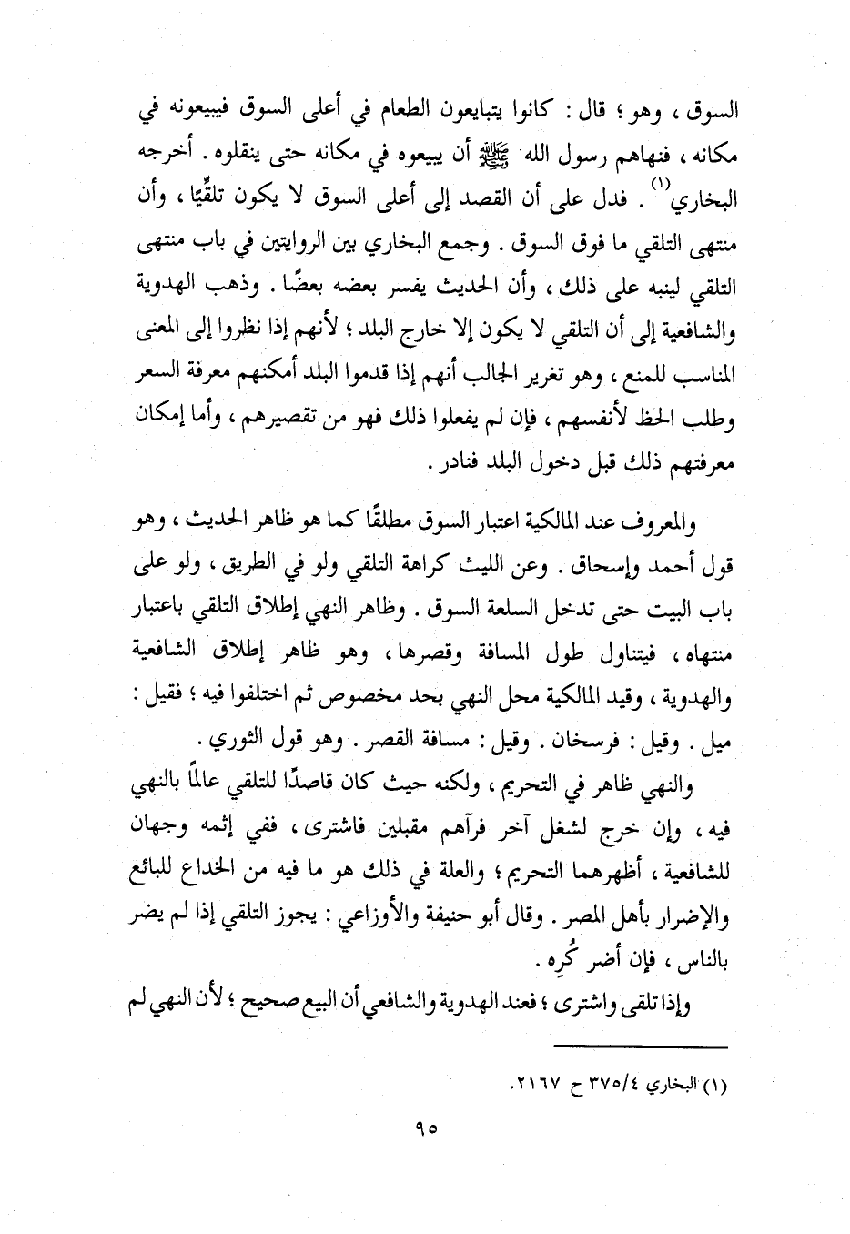 السوق، وهو؛ قال: كانوا يتبايعون الطعام في أعلى السوق فيبيعونه في مكانه، فنهاهم رسول الله - صلى الله عليه وسلم - أن يبيعوه في مكانه حتى ينقلوه. أخرجه البخاري (¬1). فدل على أن القصد إلى أعلى السوق لا يكون تلقِّيًا، وأن منتهى التلقي ما فوق السوق. وجمع البخاري بين الروايتين في باب منتهى التلقي لينبه على ذلك، وأن الحديث يفسر بعضه بعضًا. وذهب الهدوية والشافعية إلى أن التلقي لا يكون إلا خارج البلد، لأنهم إذا نظروا إلى المعنى المناسب للمنع، وهو تغرير الجالب أنهم إذا قدموا البلد أمكنهم معرفة السعر وطلب الحظ لأنفسهم، فإن لم يفعلوا ذلك فهو من تقصيرهم، وأما إمكان معرفتهم ذلك قبل دخول البلد فنادر.