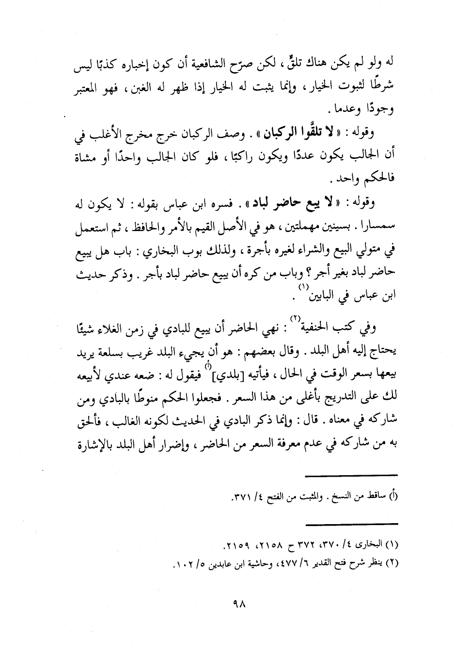 وفي كتب الحنفية (¬2): نهي الحاضر أن يبيع للبادي في زمن الغلاء شيئًا يحتاج إليه أهل البلد. وقال بعضهم: هو أن يجيء البلد غريب بسلعة يريد بيعها بسعر الوقت في الحال، فيأتيه [بلدي] (أ) فيقول له: ضعه عندي لأبيعه لك على التدريج بأغلى من هذا السعر. فجعلوا الحكم منوطًا بالبادي ومن شاركه في معناه. قال: وإنما ذكر البادي في الحديث لكونه الغالب، فألحق به من شاركه في عدم معرفة السعر من الحاضر، وإضرار أهل البلد بالإشارة