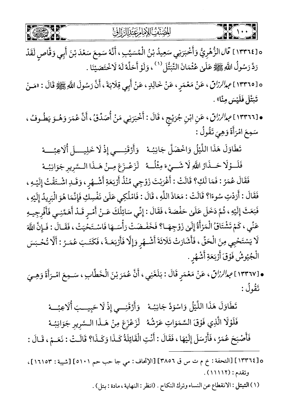 13365- عبد الرزاق، عَنْ مَعْمَرٍ، عَن خَالِدٍ، عَنْ أَبِي قِلاَبَةَ، أَنَّ رَسُولَ اللهِ صَلَّى اللهُ عَلَيْهِ وَسَلَّمَ قَالَ: مَنْ تَبَتَّلَ فَلَيْسَ مِنَّا.