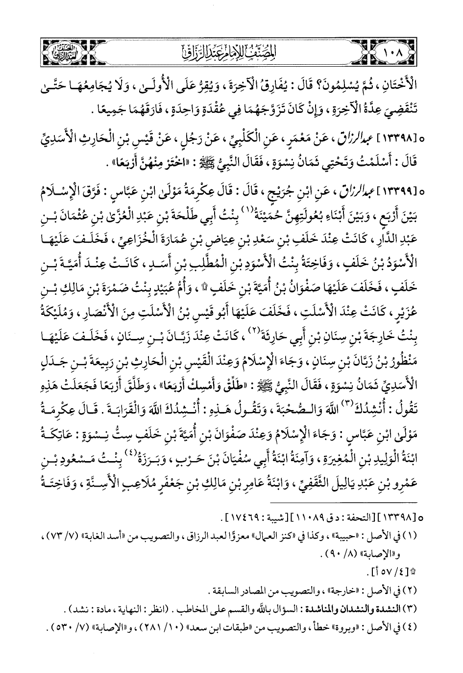 13399 - عبد الرزاق، عَنِ ابْنِ جُرَيْجٍ، قَالَ: قَالَ عِكْرِمَةُ، مَوْلَى ابْنِ عَبَّاسٍ، فَرَّقَ الإِسْلاَمُ بَيْنَ أَرْبَعٍ، وَبَيْنَ أَبْنَاءِ بُعُولَتِهِنَّ: حُمِينَةُ بِنْتُ (1) أَبِي طَلْحَةَ بْنِ عَبدِ الْعُزَّى بنِ عُثْمَانَ بْنِ عَبدِ الدَّارِ، كَانَتْ عِنْدَ خَلَفِ بْنِ أَسْعَدِ بْنِ عَامِرِ بْنِ بَيَاضَةَ الْخُزَاعِيِّ (2)، فَخَلَفَ عَلَيْهَا الأَسْوَدُ بن خَلَفٍ، وَفَاخِتَةُ بِنْتُ الأَسْوَدِ بْنِ المُطَّلِبِ بْنِ أَسَدٍ، كَانَتْ عِنْدَ أُمَيَّةَ بْنِ خَلَفٍ، فَخَلَفَ عَلَيْهَا صَفْوَانُ بن أُمَيَّةَ بْنِ خَلَفٍ، وَأُمُّ عُبَيدٍ بِنْتُ ضَمْرَةَ بْنِ مَالِكِ بْنِ عُزَيْرٍ، كَانَتْ عِنْدَ الأَسْلَتِ، فَخَلَفَ عَلَيْهَا أَبو قَيْسِ بْنِ الأَسْلَتِ، مِنَ الأَنْصَارِ، وَمُلَيْكَةُ بِنْتُ خَارِجَةَ بْنِ سِنَانِ بْنِ أَبِي حَارِثَةَ، كَانَتْ عِنْدَ زَبَّانِ بْنِ سِنَانٍ، فَخَلَفَ عَلَيْهَا مَنْظُورُ بن زَبَّانِ بْنِ سِنَانٍ، وَجَاءَ الإِسْلاَمُ وَعِنْدَ الْقَيْسِ بْنِ الْحَارِثِ بْنِ رَبِيعَةَ بْنِ جَدَلٍ الأَسَدِيِّ ثَمَانُ نِسْوَةٍ، فَقَالَ النَّبِيُّ صَلَّى اللهُ عَلَيْهِ وَسَلَّمَ: طَلِّقْ، وَأَمْسِكْ أَرْبَعًا، وَطَلَّقَ أَرْبَعًا، فَجَعَلَتْ هَذِهِ تَقُولُ: أَنْشُدُكَ اللهَ وَالصُّحْبَةَ، وَتَقُولُ هَذِهِ: أَنْشُدُكَ اللهَ وَالقَرَابَةَ.