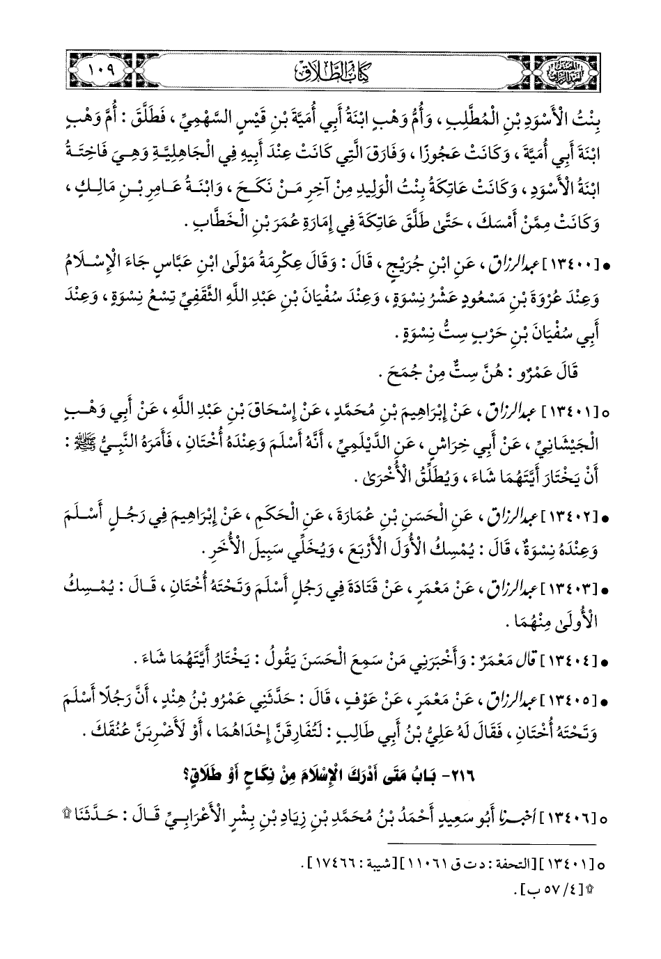 13405- عبد الرزاق، عَنْ مَعْمَرٍ، عَنْ عَوْفٍ، قَالَ: حَدَّثَنِي عَمْرُو بن هِنْدٍ، أَنَّ رَجُلاَ أَسْلَمَ وَتَحْتَهُ أُخْتَانِ، فَقَالَ لَهُ عَلِيُّ بن أَبِي طَالِبٍ: لَتُفَارِقَنَّ إِحْدَاهُمَا، أَوْ لأَضْرَبِنَّ عُنُقَكَ.