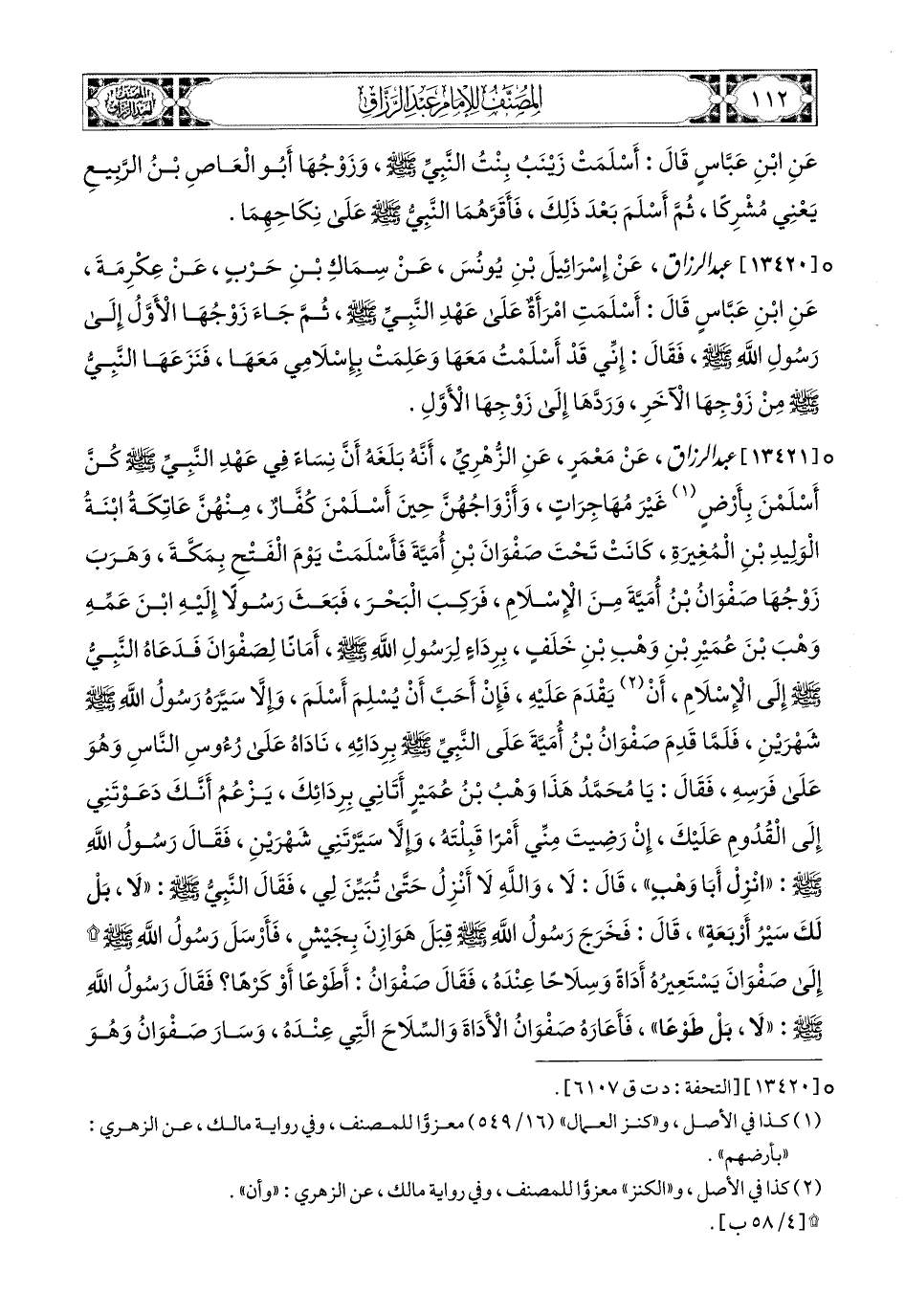 13421- عبد الرزاق، عَنْ مَعْمَرٍ، عَنِ الزُّهْرِيِّ، أَنَّهُ بَلَغَهُ، أَنَّ نِسَاءً فِي عَهْدِ النَّبِيِّ صَلَّى اللهُ عَلَيْهِ وَسَلَّمَ كُنَّ أَسْلَمْنَ بِأَرْضٍ، غَيْرَ مُهَاجِرَاتٍ وَأَزْوَاجُهُنَّ حِينَ أَسْلَمْنَ كُفَّارٌ، مِنْهُنَّ عَاتِكَةُ ابْنَةُ الْوَلِيدِ بْنِ المُغِيرَةِ، كَانَتْ تَحْتَ صَفْوَانَ بْنِ أُمَيَّةَ، فَأَسْلَمَتْ يَوْمَ الْفَتْحِ بِمَكَّةَ، وَهَرَبَ زَوْجُهَا صَفْوَانُ بن أُمَيَّةَ مِنَ الإِسْلاَمِ، فَرَكِبَ الْبَحْرَ، فَبَعَثَ رَسُولاً إِلَيْهِ ابْنَ عَمِّهِ وَهْبَ بن عُمَيْرِ بْنِ وَهْبِ بْنِ خَلَفِ بِرِدَاءٍ لِرَسُولِ اللهِ صَلَّى اللهُ عَلَيْهِ وَسَلَّمَ أَمَانًا لِصَفْوَانَ، فَدَعَاهُ النَّبِيُّ صَلَّى اللهُ عَلَيْهِ وَسَلَّمَ إِلَى الإِسْلاَمِ، أَنْ يَقْدَمَ عَلَيْهِ، فَإِنْ أَحَبَّ أَنْ يُسْلِمَ أَسْلَمَ، وَإِلاَّ سَيَّرَهُ رَسُولُ اللهِ صَلَّى اللهُ عَلَيْهِ وَسَلَّمَ شَهْرَيْنِ، فَلَمَّا قَدِمَ صَفْوَانُ بن أُمَيَّةَ عَلَى النَّبِيِّ صَلَّى اللهُ عَلَيْهِ وَسَلَّمَ بِرِدَائِهِ، نَادَاهُ عَلَى رُؤُوسِ النَّاسِ وَهُوَ عَلَى فَرَسِهِ، فَقَالَ: يَا مُحَمَّدُ، هَذَا وَهْبُ بن عُمَيْرٍ أَتَانِي بِرِدَائِكَ، يَزْعُمُ أَنَّكَ دَعَوْتَنِي إِلَى الْقُدُومِ عَلَيْكَ، إِنْ رَضِيتَ مِنِّي أَمْرًا قَبِلْتَهُ، وَإِلاَّ سَيَّرْتَنِي شَهْرَيْنِ، فَقَالَ رَسُولُ اللهِ صَلَّى اللهُ عَلَيْهِ وَسَلَّمَ: انْزِلْ أَبَا وَهْبٍ، قَالَ: لاَ، وَاللهِ لاَ أَنْزِلُ حَتَّى تَبِينَ لِي.
