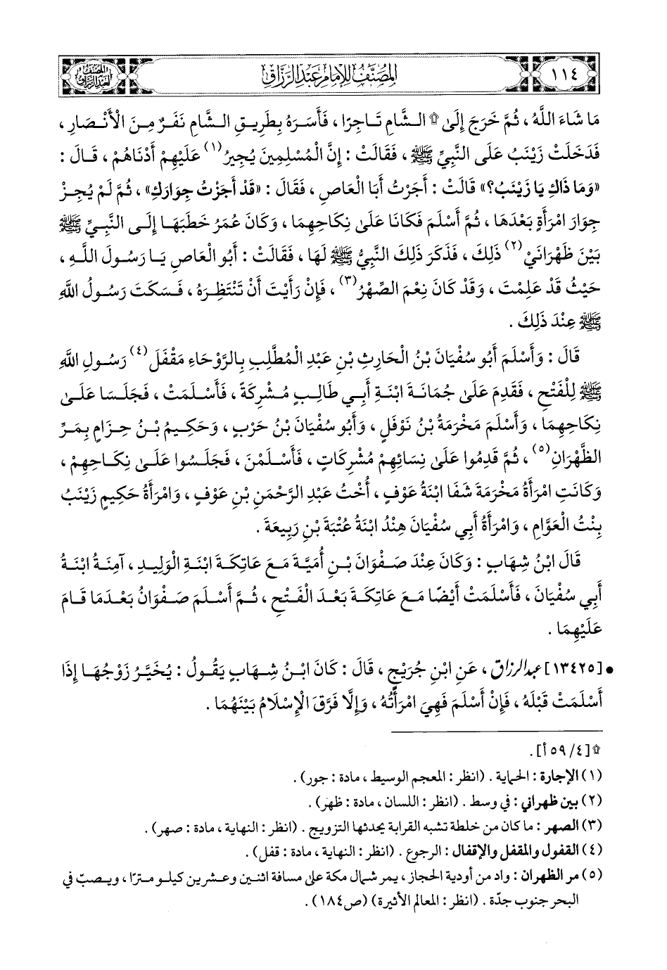 قَالَ: وَمَا ذَاكَ يَا زَيْنَبُ؟ قَالَتْ: أَجَرْتُ أَبَا الْعَاصِ، فَقَالَ: قَدْ أَجَزْتُ جِوَارَكِ، ثُمَّ لَمْ يُجِزْ جِوَارَ امْرَأَةٍ بَعْدَهَا، ثُمَّ أَسْلَمَ، فَكَانَا عَلَى نِكَاحِهِمَا، وَكَانَ عُمَرُ خَطَبَهَا إِلَى النَّبِيِّ صَلَّى اللهُ عَلَيْهِ وَسَلَّمَ بَيْنَ ظَهْرَانِي ذَلِكَ، فَذَكَرَ ذَلِكَ النَّبِيُّ صَلَّى اللهُ عَلَيْهِ وَسَلَّمَ لَهَا، فَقَالَتْ: أَبو الْعَاصِ يَا رَسُولَ اللهِ حَيْثُ قَدْ عَلِمْتَ، وَقَدْ كَانَ نِعْمَ الصِّهْرُ، فَإِنْ رَأَيْتَ أَنْ تَنْتَظِرَهُ، فَسَكَتَ رَسُولُ اللهِ صَلَّى اللهُ عَلَيْهِ وَسَلَّمَ عِنْدَ ذَلِكَ، قَالَ: وَأَسْلَمَ أَبو سُفْيَانَ بن الْحَارِثِ بْنِ عَبدِ المُطَّلِبِ بِالرَّوْحَاءِ، مَقْفِلِ رَسُولِ اللهِ صَلَّى اللهُ عَلَيْهِ وَسَلَّمَ لِلْفَتْحِ، فَقَدِمَ عَلَى جُمَانَةَ ابْنَةِ أَبِي طَالِبٍ مُشْرِكَةٍ، فَأَسْلَمَتْ، فَجَلَسَا عَلَى نِكَاحِهِمَا، وَأَسْلَمَ مَخْرَمَةُ بن نَوْفَلٍ، وَأَبو سُفْيَانَ بن حَرْبٍ، وَحَكِيمُ بن حِزَامٍ بِمَرِّ الظَّهْرَانِ، ثُمَّ قَدِمُوا عَلَى نِسَائِهِمْ مُشْرِكَاتٍ، فَأَسْلَمْنَ، فَجَلَسُوا عَلَى نِكَاحِهِمْ، وَكَانَتِ امْرَأَةُ مَخْرَمَةَ شَفَا ابْنَةَ عَوْفٍ، أُخْتَ عَبدِ الرَّحْمَنِ بْنِ عَوْفٍ، وَامْرَأَةُ حَكِيمٍ زَيْنَبَ بِنْتَ الْعَوَّامِ، وَامْرَأَةُ أَبِي سُفْيَانَ هِنْدَ ابْنَةَ عُتْبَةَ بْنِ رَبِيعَةَ.