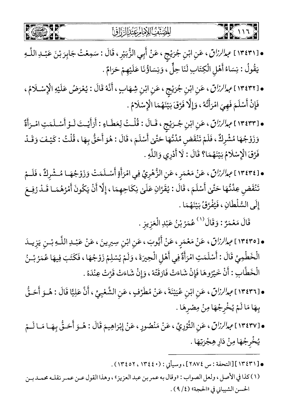 13431- عبد الرزاق، عَنِ ابْنِ جُرَيْجٍ، عَنْ أَبِي الزُّبَيْرِ، قَالَ: سَمِعْتُ جَابِرَ بن عَبدِ اللهِ يَقُولُ: نِسَاءُ أَهْلِ الْكِتَابِ لَنَا حِلٌّ، وَنِسَاؤُنَا عَلَيْهِمْ حَرَامٌ.