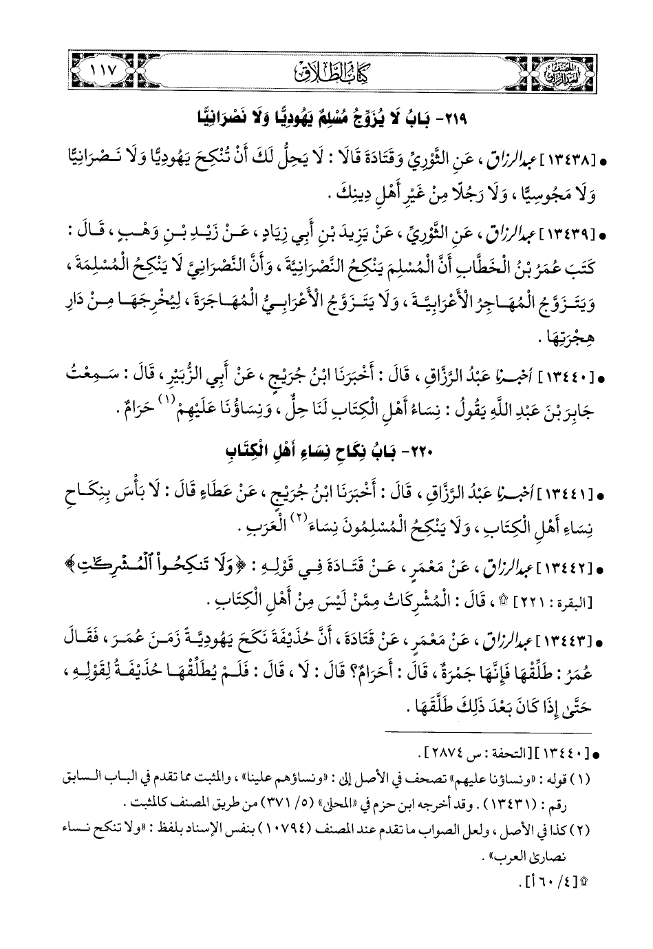 13441- أخبرنا عبد الرزاق، قَالَ: أَخْبَرَنَا ابْنُ جُرَيْجٍ، عَنْ عَطَاءٍ، قَالَ: لاَ بَأْسَ بِنِكَاحِ نِسَاءِ أَهْلِ الْكِتَابِ، وَلاَ يَنْكِحُ المُسْلِمُونَ نِسَاءَ [نَصَارَى] (1) الْعَرَبِ.