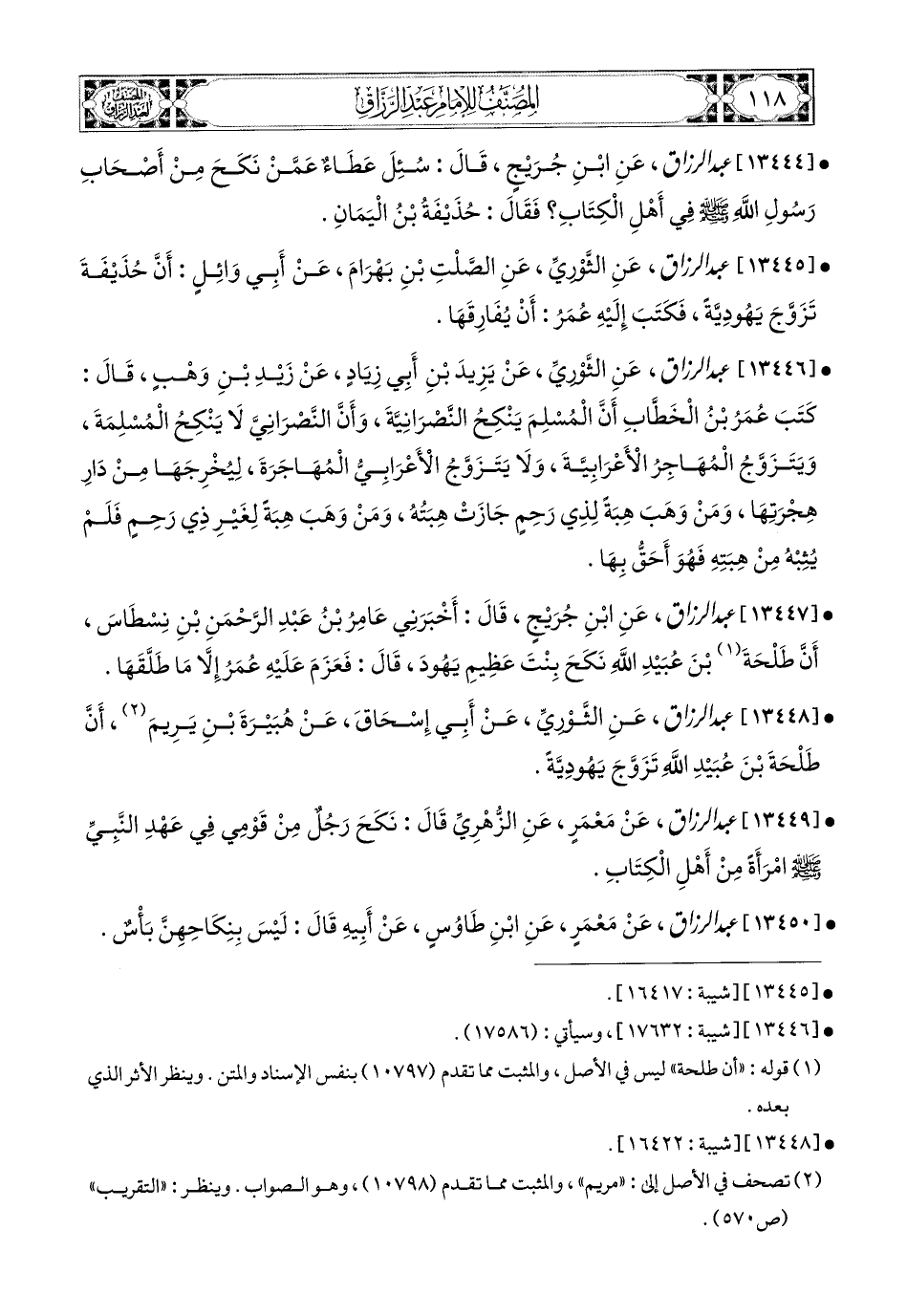 13447- عبد الرزاق، عَنِ ابْنِ جُرَيْجٍ، قَالَ: أَخْبَرَنِي عَامِرُ بن عَبدِ الرَّحْمَنِ بْنِ نِسْطَاسَ، أَنَّ طَلْحَةَ بْنِ عُبَيْدِ اللهِ نَكَحَ بِنْتَ عَظِيمِ يَهُودٍ، قَالَ: فَعَزَمَ عَلَيْهِ عُمَرُ إِلاَّ مَا طَلَّقَهَا.