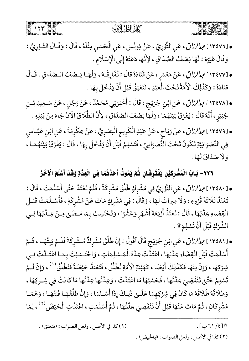 13481 - عبد الرزاق، عَنِ ابْنِ جُرَيْجٍ، قَالَ: أَقُولُ: إِنْ طَلَّقَ مُشْرِكٌ مُشْرِكَةً فَلَمْ يَبِتَّهَا، ثُمَّ أَسْلَمَتْ قَبْلَ انْقِضَاءِ عِدَّتِهَا، اعْتَدَّتْ عِدَّةَ المُسْلِمَاتِ، وَاحْتَسَبَتْ بِمَا اعْتَدَّتْ فِي شِرْكِهَا، وَإِنْ بَتَّهَا، فَكَذَلِكَ أَيْضًا كَهَيْئَةِ الأَمَةِ تُطَلَّقُ فَتَعْتَدُّ حَيْضَةً، فَتُعْتَقُ (1)، وَإِنْ لَمْ تُسْلِمْ حَتَّى تَنْقَضِي عِدَّتُهَا، فَحَسْبُهَا مَا اعْتَدَّتْ، وَعِدَّتُهَا عِدَّتُهَا مَا كَانَتْ فِي شِرْكِهَا، وَطَلاَقُهُ طَلاَقُهُ مَا كَانَ فِي شِرْكِهِمَا عَلَى ذَلِكَ إِذَا أَسْلَمَا، وَإِنْ طَلَّقَهَا فَبَتَّهَا وَهُمَا مُشْرِكَانِ، ثُمَّ مَاتَ عَنْهَا قَبْلَ أَنْ تَنْقَضِيَ عِدَّتُهَا، ثُمَّ أَسْلَمَتِ اعْتَدَّتِ الْحَيْضَ (2) لِمَا مَضَى، وَلَمْ تَعْتَدَّ عِدَّةَ المُتَوَفَّى عَنْهَا مِنْ أَجْلِ الْبَتِّ، وَإِنْ أَسْلَمَتْ بَعْدَ الْبَتِّ قَبْلَ أَنْ يَمُوتَ، ثُمَّ مَاتَ، فَكَذَلِكَ أَيْضًا، وَإِنْ طَلَّقَهَا وَلَمْ يَبِتَّهَا، ثُمَّ أَسْلَمَتْ، ثُمَّ مَاتَ عَنْهَا قَبْلَ انْقِضَاءِ عِدَّتِهَا، فَأَسْلَمَتْ بَعْدَ مَوْتِهِ، اعْتَدَّتْ عِدَّةَ المُتَوَفَّى عَنْهَا، مِنْ أَجْلِ [أنَّ] (3) الإِسْلاَم كَانَ بَعْدَ مَوْتِهِ كَمَا إِذَا طَلَّقَهَا فَلَمْ يَبِتَّهَا، ثُمَّ أَسْلَمَتْ قَبْلَ انْقِضَاءِ عِدَّتِهَا اعْتَدَّتْ عِدَّةَ المُسْلِمَةِ، وَحَسَبَتْ مَا مَضَى مِنْ عِدَّتِهَا فِي شِرْكِهَا فَقَدْ أَسْلَمَتْ وَهِيَ امْرَأَتُهُ، ثُمَّ لَمْ تَسْتَقْبِلْ عِدَّةَ المُطَلَّقَةِ.
