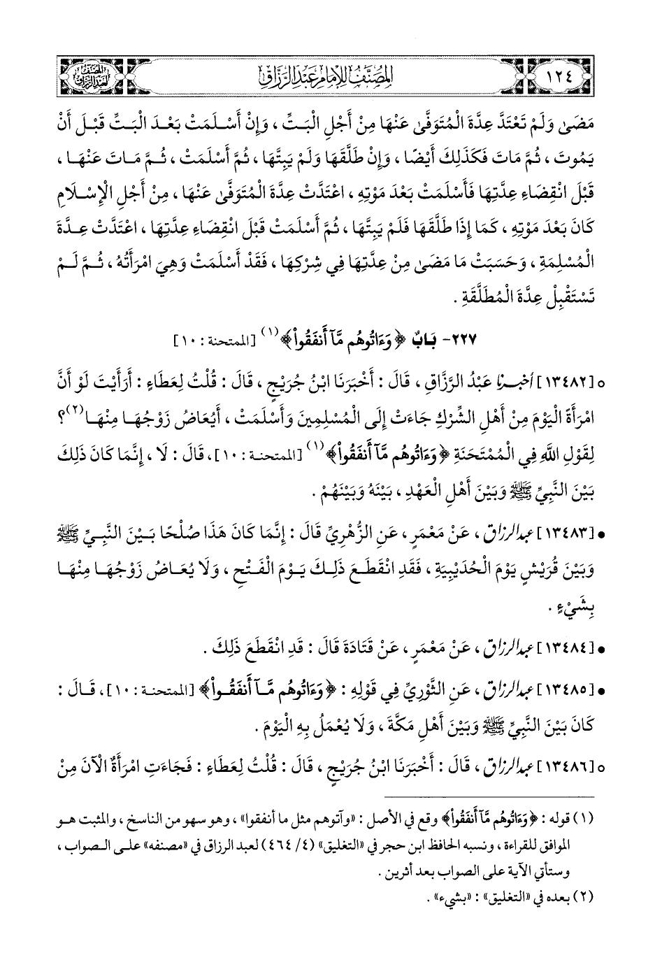 13482- أخبرنا عبد الرزاق، قَالَ: أَخْبَرَنَا ابْنُ جُرَيْجٍ، قَالَ: قُلْتُ لِعَطَاءٍ: أَرَأَيْتَ لَوْ أَنَّ امْرَأَةً الْيَوْمَ مِنْ أَهْلِ الشِّرْكِ جَاءَتْ إِلَى المُسْلِمَيْنَ وَأَسْلَمَتْ، أَيُعَاضُ زَوْجُهَا مِنْهَا [بشيء] (1) لِقَوْلِ اللهِ فِي المُمْتَحَنَةِ: {وَآتُوهُمْ مَا أَنْفَقُوا} (2)؟ قَالَ: لاَ، إِنَّمَا كَانَ ذَلِكَ بَيْنَ النَّبِيِّ صَلَّى اللهُ عَلَيْهِ وَسَلَّمَ وَبَيْنَ أَهْلِ الْعَهْدِ بَيْنَهُ وَبَيْنَهُمْ.