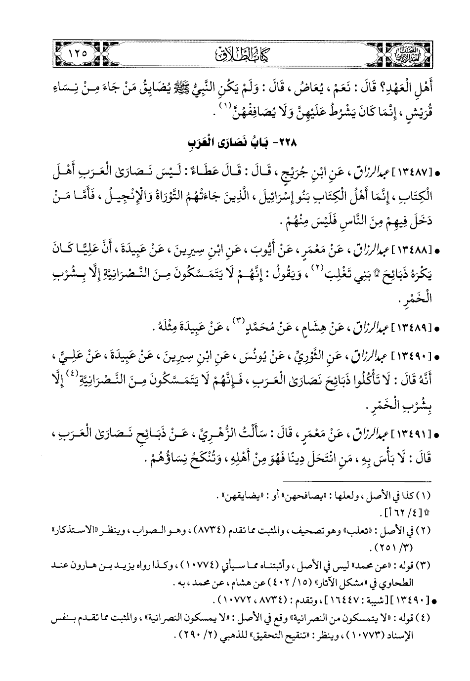13491- عبد الرزاق، عَنْ مَعْمَرٍ، قَالَ: سَأَلْتُ الزُّهْرِيَّ عَن ذَبَائِحِ نَصَارَى الْعَرَبِ قَالَ: لاَ بَأْسَ بِهِ، مَنِ انْتَحَلَ دِينًا فَهُوَ مِنْ أَهْلِهِ، وَتُنْكَحُ نِسَاؤُهُمْ.