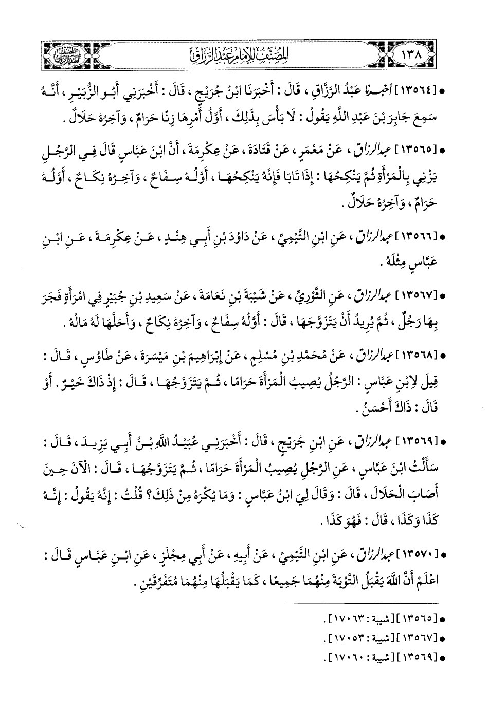 13565- عبد الرزاق، عَنْ مَعْمَرٍ، عَن قَتَادَةَ، عَنْ عِكْرِمَةَ، أَنَّ ابْنَ عَبَّاسٍ قَالَ فِي الرَّجُلِ يَزْنِي بِالمَرْأَةِ، ثُمَّ يَنْكَحُهَا إِذَا تَابَا، فَإِنَّهُ يَنْكِحُهَا، أَوَّلُهُ سِفَاحٌ، وَآخِرُهُ نِكَاحٌ، أَوَّلُهُ حَرَامٌ، وَآخِرُهُ حَلاَلٌ.