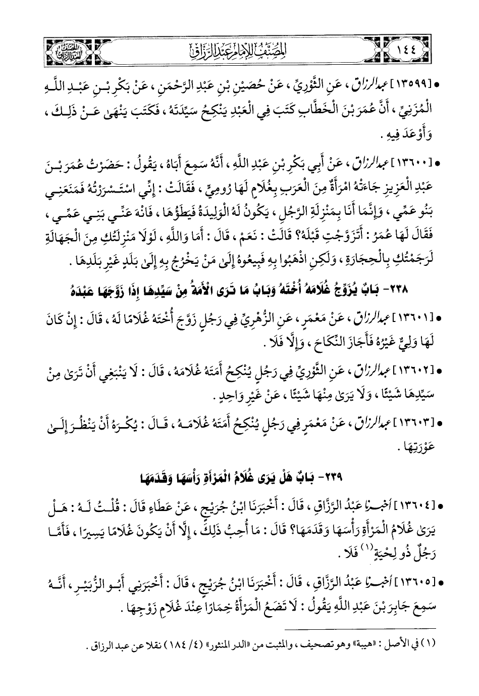 13599- عبد الرزاق، عَنِ الثَّورِيِّ، عَن حُصَيْنِ بْنِ عَبدِ الرَّحْمَنِ، عَن بَكْرِ بْنِ عَبدِ اللهِ المُزَنِيِّ، أَنَّ عُمَرَ بن الْخَطَّابِ كَتَبَ فِي الْعَبْدِ يَنْكِحُ سَيِّدَتَهُ، فَكَتَبَ يَنْهَى عَن ذَلِكَ، وَأَوْعَدَ فِيهِ.