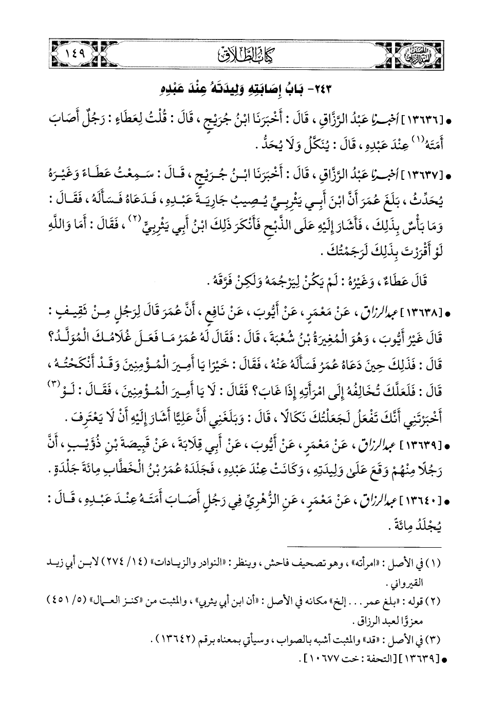 13636- أخبرنا عبد الرزاق، قَالَ: أَخْبَرَنَا ابْنُ جُرَيْجٍ، قَالَ: قُلْتُ لِعَطَاءٍ: رَجُلٌ أَصَابَ أَمَتَهُ عِنْدَ عَبدِهِ، قَالَ: يُنَكَّلُ وَلاَ يُحَدُّ.
