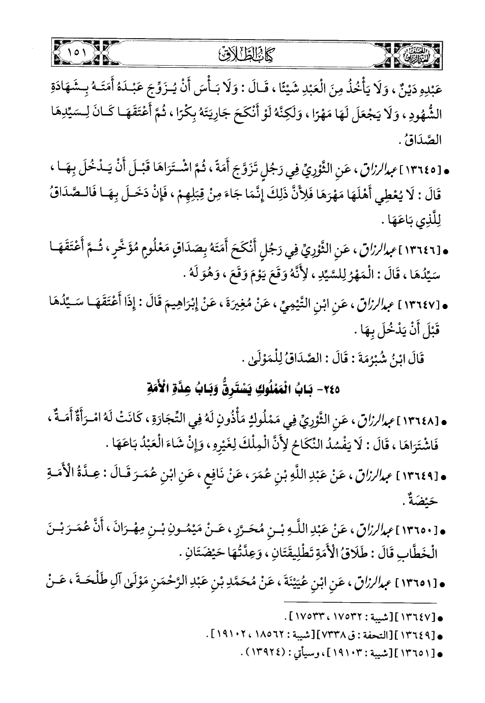 13651- عبد الرزاق، عَنِ ابْنِ عُيَيْنَةَ، عَن مُحَمَّدِ بْنِ عَبدِ الرَّحْمَنِ، مَوْلَى آلِ طَلْحَةَ، عَن سُلَيْمَانَ بْنِ يَسَارٍ، عَنْ عَبدِ اللهِ بْنِ عُتْبَةَ، عَن عُمَرَ بْنِ الْخَطَّابِ قَالَ: يَنْكِحُ الْعَبْدُ ثِنْتَيْنِ، وَيُطَلِّقُ تَطْلِيقَتَيْنِ، وَتَعْتَدُّ الأَمَةُ حَيْضَتَيْنِ، فَإِنْ لَمْ تَحِضْ، فَشَهْرَيْنِ، أَوْ قَالَ: فَشَهْرٌ وَنِصْفٌ.