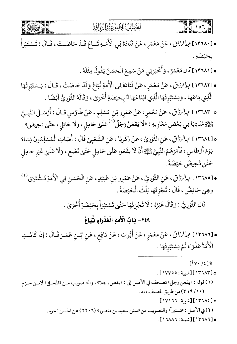 13683- عبد الرزاق، عَنْ مَعْمَرٍ، عَنْ عَمْرِو بنِ مُسْلِمٍ، عَن طَاوُوسٍ، قَالَ: أَرْسَلَ النَّبِيُّ صَلَّى اللهُ عَلَيْهِ وَسَلَّمَ مُنَادِيًا فِي بَعْضِ مَغَازِيهِ: لاَ يَقَعَنَّ (1) رَجُلٌ عَلَى حَامِلٍ، وَلاَ حَائِلٍ حَتَّى تَحِيضَ.