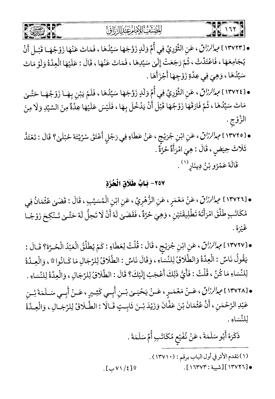 13725- عبد الرزاق، عَنِ ابْنِ جُرَيْجٍ، عَنْ عَطَاءٍ؛ فِي رَجُلٍ أَعْتَقَ سُرِّيَّتَهُ حُبْلَى؟ قَالَ: تَعْتَدُّ ثَلاَثَ حِيَضٍ، قَالَ: هِيَ امْرَأَةٌ حُرَّةٌ.