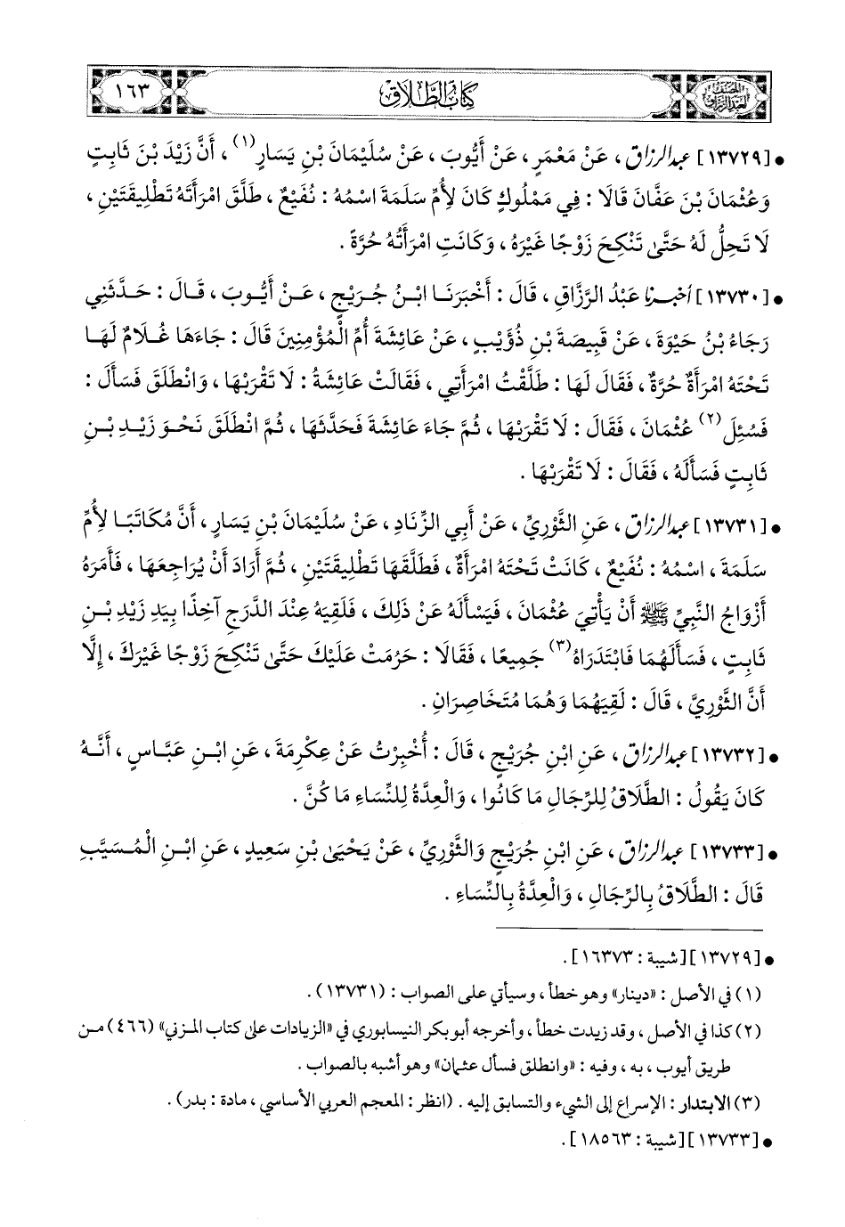 13731- عبد الرزاق، عَنِ [مالك و] (1) الثَّورِيِّ، عَنْ أَبِي الزِّنَادِ، عَن سُلَيْمَانَ بْنِ يَسَارٍ، أَنَّ مُكَاتَبًا لأُمِّ سَلَمَةَ اسْمُهُ: نُفَيْعٌ، كَانَتْ تَحْتَهُ امْرَأَةٌ، فَطَلَّقَهَا تَطْلِيقَتَيْنِ، ثُمَّ أَرَادَ أَنْ يُرَاجِعَهَا، فَأَمَرَهُ أَزْوَاجُ النَّبِيِّ صَلَّى اللهُ عَلَيْهِ وَسَلَّمَ أَنْ يَأْتِيَ عُثْمَانَ، فَيسَأَلَهُ عَن ذَلِكَ، فَلَقِيَهُ عِنْدَ الدَّرَجِ، آخِذًا بِيَدِ زَيْدِ بْنِ ثَابِتٍ، فَسَأَلَهُمَا، فَابْتَدَرَاهُ جَمِيعًا، فَقَالاَ: حَرُمَتْ عَلَيْكَ، حَتَّى تَنْكِحَ زَوْجًا غَيْرَكَ. إِلاَّ أَنَّ الثَّورِيَّ قَالَ: لَقِيَهُمَا وَهُمَا مُتَخَاصِرَانِ.