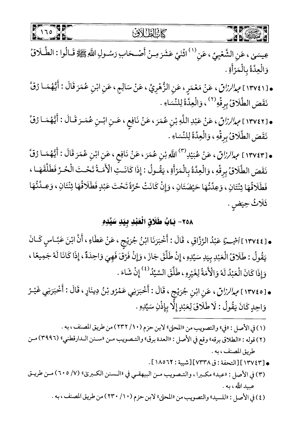 13745- عبد الرزاق، عَنِ ابْنِ جُرَيْجٍ، قَالَ: أَخْبَرَنِي عَمْرُو بن دِينَارٍ قَالَ: أَخْبَرَنِي غَيْرُ وَاحِدٍ [أَنَّ ابْنَ عَبَّاسٍ] (1) كَانَ يَقُولُ: لاَ طَلاَقَ لِعَبْدٍ إِلاَّ بِإِذْنِ سَيِّدِهِ.