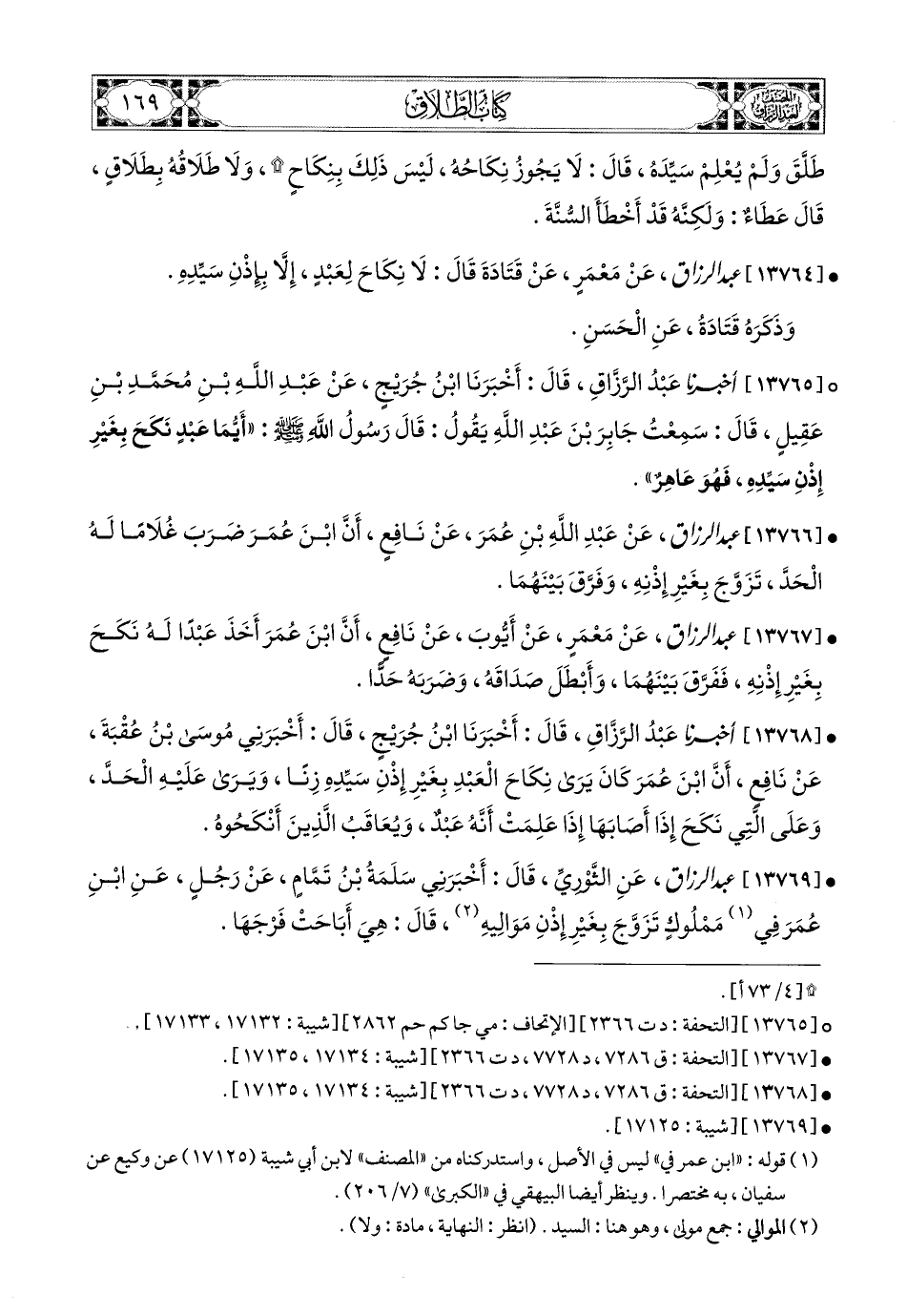 13766- عبد الرزاق، عَنْ عَبدِ اللهِ بْنِ عُمَرَ، عَن نَافِعٍ، أَنَّ ابْنَ عُمَرَ ضَرَبَ غُلاَمًا لَهُ الْحَدَّ تَزَوَّجَ بِغَيْرِ إِذْنِهِ، وَفَرَّقَ بَيْنَهُمَا.