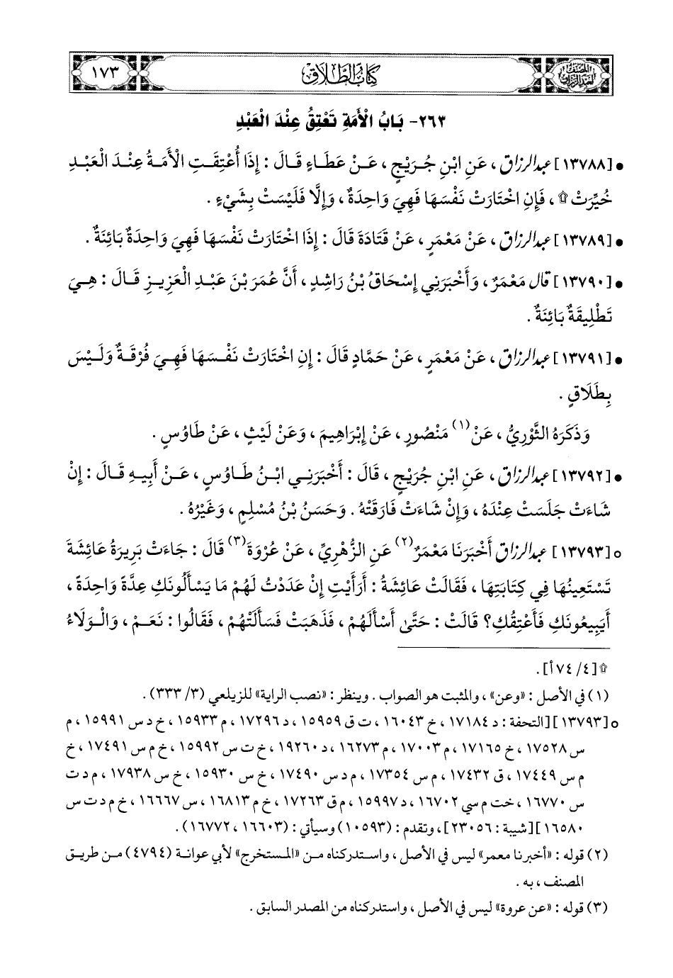 13793 - عبد الرزاق، [أَخْبَرَنَا مَعْمَرٌ] (1)، عَنِ الزُّهْرِيِّ، عَنْ عُرْوَةَ (2)، قَالَ: جَاءَتْ بَرِيرَةُ عَائِشَةَ تَسْتَعِينُهَا فِي كِتَابَتِهَا، فَقَالَتْ عَائِشَةُ: أَرَأَيْتِ إِنْ عَدَدْتُ لَهُمْ مَا يَسْأَلُونَكِ عِدَّةً وَاحِدَةً، أَيَبِيعُونَكِ فَأَعْتِقُكِ؟ قَالَتْ: حَتَّى أَسْأَلَهُمْ، فَذَهَبَتْ، فَسَأَلَتْهُمْ، فَقَالُوا: نَعَمْ، وَالْوَلاَءُ لَنَا، فَدَخَلَ عَلَيْهَا النَّبِيُّ صَلَّى اللهُ عَلَيْهِ وَسَلَّمَ، فَذَكَرَتْ ذَلِكَ لَهُ، فَقَالَ: اشْتَرِيهَا وَأَعْتِقِيهَا، فَإِنَّ الْوَلاَءَ لِمَنْ أَعْتَقَ، فَاشْتَرَتْهَا فَأَعْتَقَتْهَا، ثُمَّ قَامَ النَّبِيُّ صَلَّى اللهُ عَلَيْهِ وَسَلَّمَ خَطِيبًا، فَقَالَ: مَا بَالُ أَقْوَامٍ يَشْتَرِطُونَ شُرُوطًا لَيْسَتْ فِي كِتَابِ اللهِ، مَنِ اشْتَرَطَ شَرْطًا لَيْسَ فِي كِتَابِ اللهِ، فَشَرْطُهُ ذَلِكَ بَاطِلٌ، وَإِنِ اشْتَرَطَ مِئَةَ شَرْطٍ، شَرْطُ اللهِ أَحَقُّ وَأَوْثَقُ.