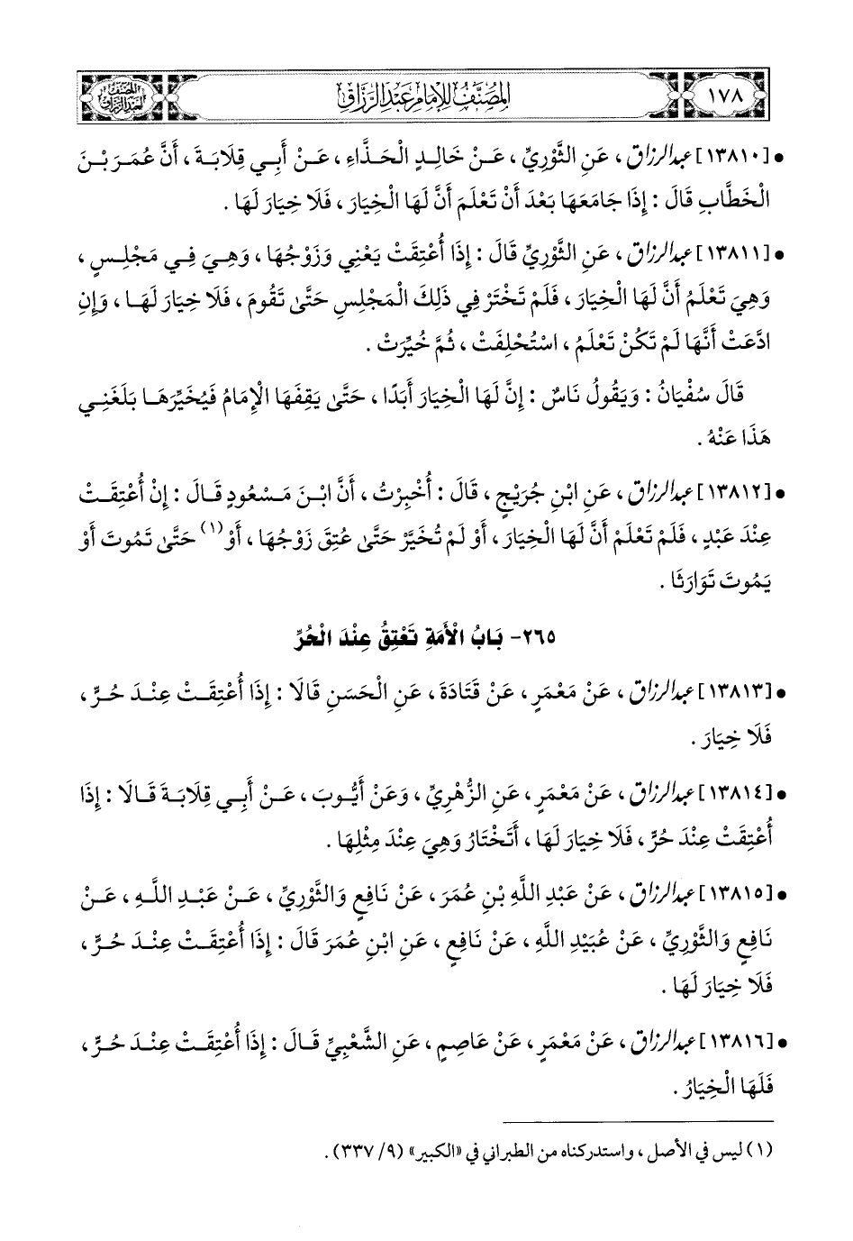 13813- عبد الرزاق، عَنْ مَعْمَرٍ، عَن قَتَادَةَ، عَنِ الْحَسَنِ، قَالاَ: إِذَا أُعْتِقَتْ عِنْدَ حُرِّ فَلاَ خِيَارَ [لها] (1).
