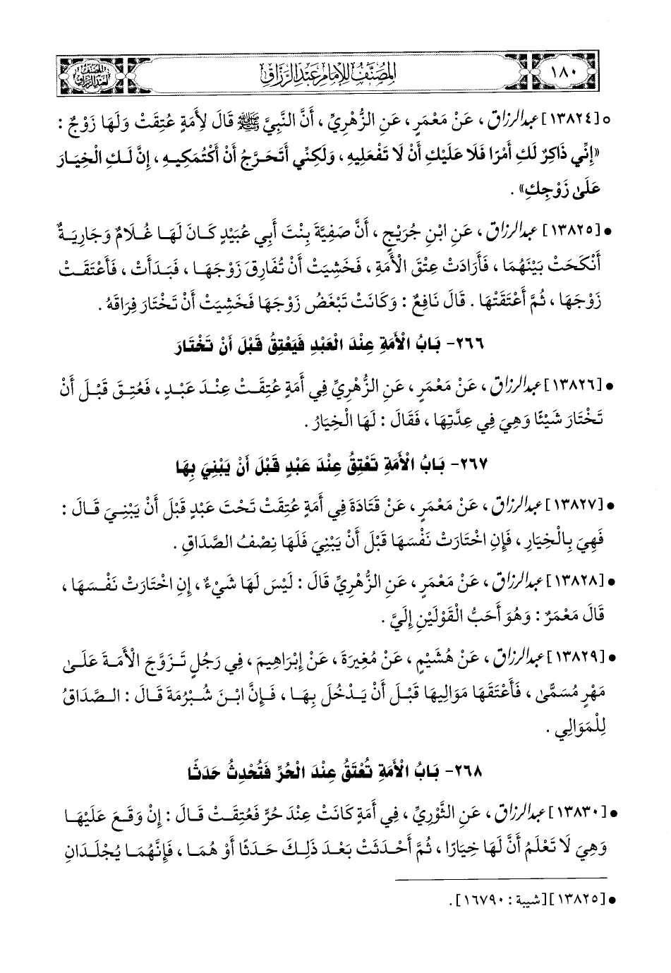 13826- عبد الرزاق، عَنْ مَعْمَرٍ، عَنِ الزُّهْرِيِّ فِي أَمَةٍ عُتِقَتْ عِنْدَ عَبدٍ، فَعُتِقَ قَبْلَ أَنْ تَخْتَارَ شَيْئًا وَهِيَ فِي عِدَّتِهَا، فَقَالَ: لَهَا الْخِيَارُ.