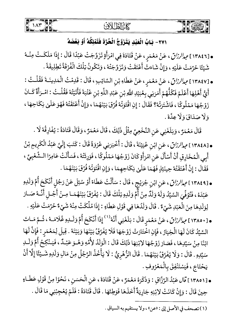 13847 - عبد الرزاق، عَنْ مَعْمَرٍ، عَنْ عَطَاءِ بْنِ السَّائِبِ قَالَ: قَدِمْتُ المَدِينَةَ، فَقُلتُ: أَيُّ أَهْلِهَا أَعْلَمُ، فَكُلُّهُمْ أَمَرَنِي بِعُبَيْدِ اللهِ بْنِ عَبدِ اللهِ بْنِ عُتْبَةَ، فَأَتَيْتُهُ، فَقُلْتُ: امْرَأَةٌ كَانَ زَوْجُهَا مَمْلُوكًا، فَاشْتَرَتْهُ؟ فَقَالَ: إِنِ اقْتَوَتْهُ فُرِّقَ بَيْنَهُمَا، وَإِنْ أَعْتَقَتْهُ، فَهُما عَلَى نِكَاحِهَما (1)، وَلاَ صَدَاقَ وَلاَ عِدَّةَ.