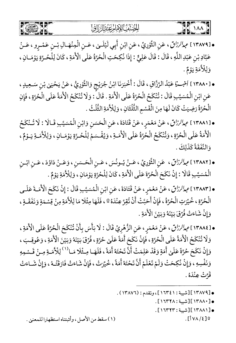 13880- أخبرنا عبد الرزاق، قَالَ: أَخْبَرَنَا ابْنُ جُرَيْجٍ، وَالثَّورِيُّ، عَن يَحيَى بنِ سَعيدٍ، عَنِ ابْنِ المُسَيَّبِ، قَالَ: تُنْكَحُ الْحُرَّةُ عَلَى الأَمَةِ. قَالَ: وَلاَ تُنْكَحُ الأَمَةُ عَلَى الْحُرَّةِ، فَإِنِ الْحُرَّةُ رَضِيَتْ كَانَ لَهَا مِنَ الْقَسْمِ الثُّلُثَانِ، وَلِلأَمَةِ الثُّلُثُ.
