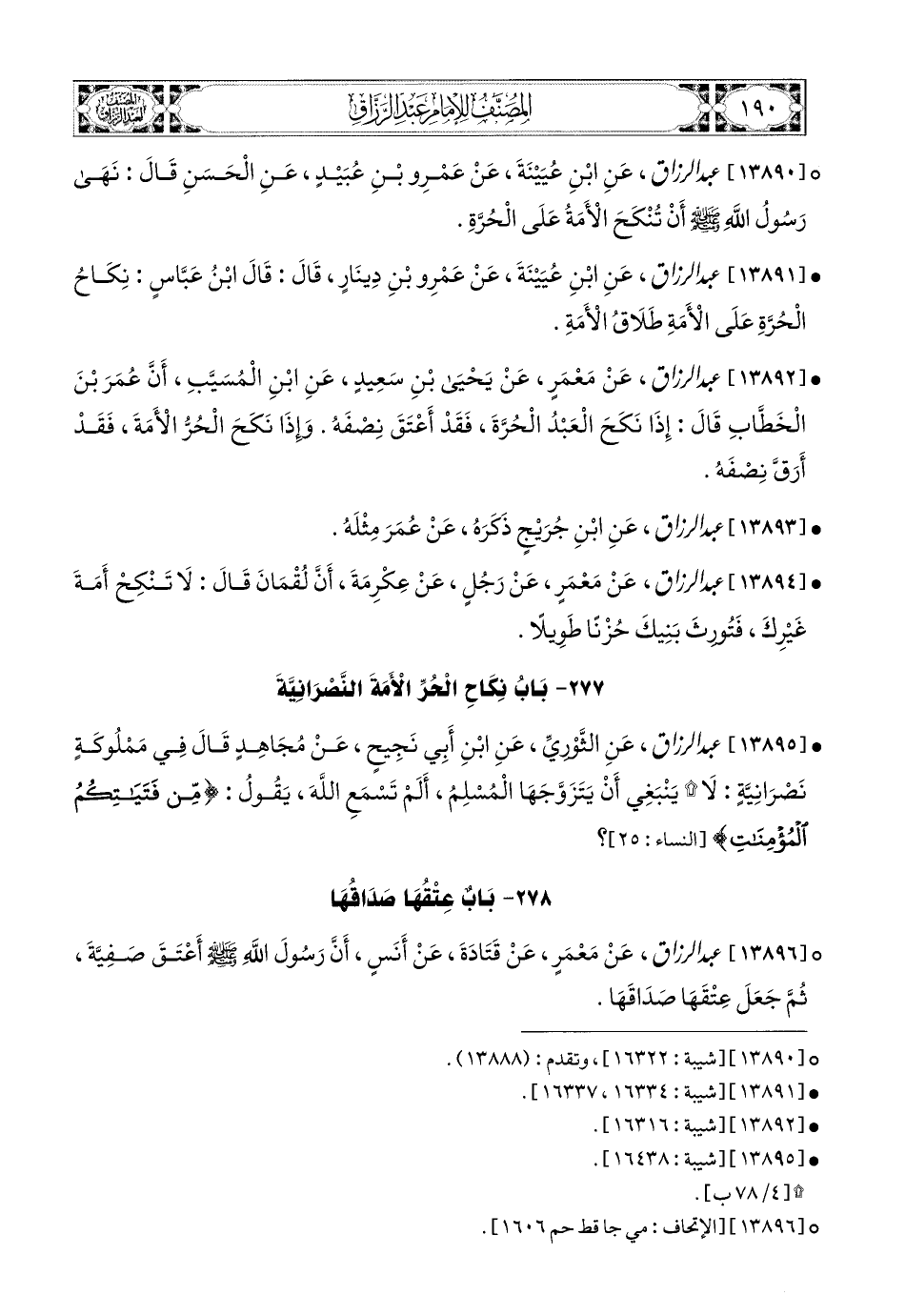 13896- عبد الرزاق، عَنْ مَعْمَرٍ، عَن قَتَادَةَ، عَنْ أَنَسٍ، أَنَّ رَسُولَ اللهِ صَلَّى اللهُ عَلَيْهِ وَسَلَّمَ أَعْتَقَ صَفِيَّةَ، ثُمَّ جَعَلَ عِتْقَهَا صَدَاقَهَا.