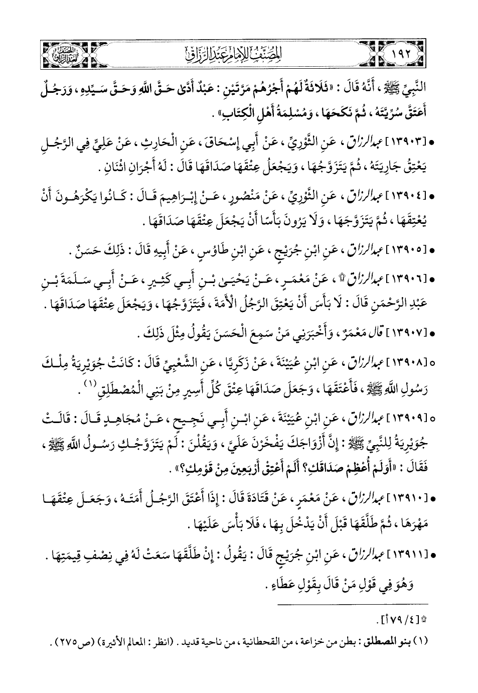 13904- عبد الرزاق، عَنِ الثَّورِيِّ، عَنْ مَنصُورٍ، عَن إِبرَاهِيمَ، قَالَ: كَانُوا يَكْرَهُونَ أَنْ يُعْتِقَهَا، ثُمَّ يَتَزَوَّجَهَا، وَلاَ يَرُونَ بَأَسًا أَنْ يَجْعَلَ عِتْقَهَا صَدَاقَهَا.