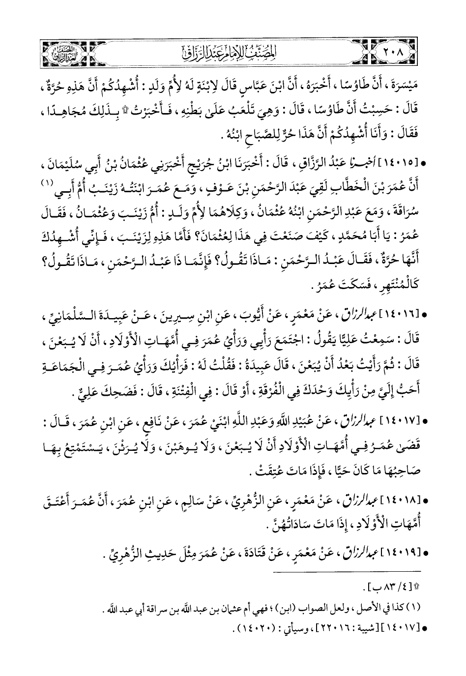 14018- عبد الرزاق، عَنْ مَعْمَرٍ، عَنِ الزُّهْرِيِّ، عَن سَالِمٍ، عَنِ ابْنِ عُمَرَ، أَنَّ عُمَرَ أَعْتَقَ أُمَّهَاتِ الأَوْلاَدِ، إِذَا مَاتَ سَادَاتُهُنَّ.