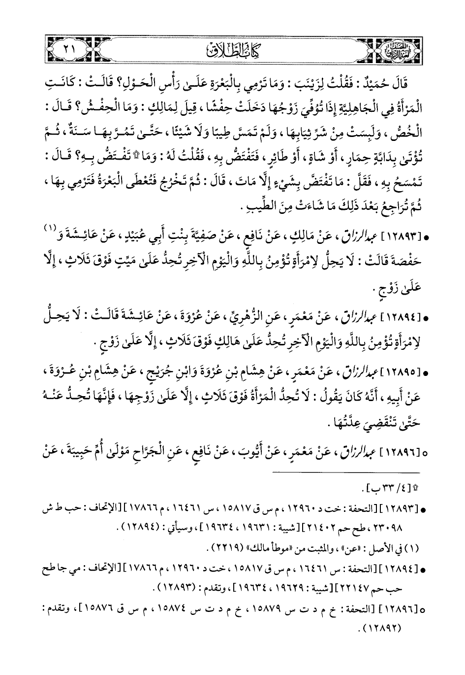 12894- عبد الرزاق، عَنْ مَعْمَرٍ، عَنِ الزُّهْرِيِّ، عَن عُرْوَةَ، عَنْ عَائِشَةَ، قَالَتْ: لاَ يَحِلُّ لاِمْرَأَةٍ تُؤْمِنُ باللهِ وَالْيَوْمِ الآخِرِ تُحِدُّ عَلَى هَالِكٍ فَوْقَ ثَلاَثٍ إِلاَّ عَلَى زَوْجٍ.