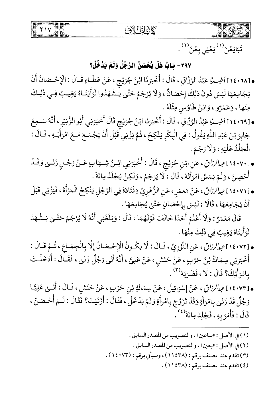 14070- عبد الرزاق، عَنِ ابْنِ جُرَيْجٍ، قَالَ: أَخْبَرَنِي ابْنُ شِهَابٍ، عَن رَجُلٍ زَنَى وَقَدْ أَحْصَنَ، وَلَمْ يَمَسَّ امْرَأَتَهُ، قَالَ: لاَ يُرْجَمُ، وَلَكِنْ يُجْلَدُ مِئةً.