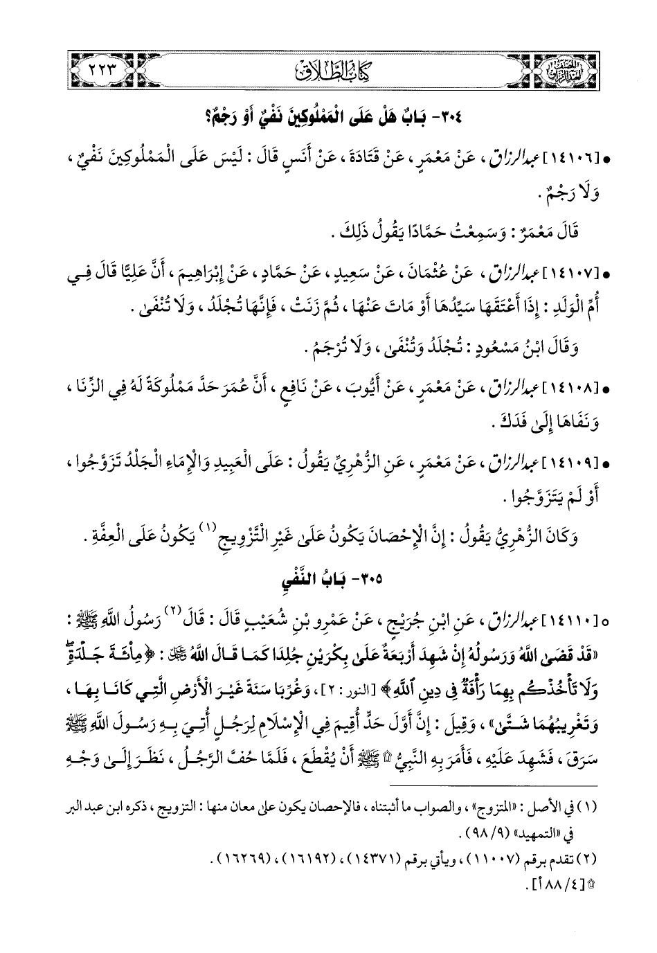 14109- عبد الرزاق، عَنْ مَعْمَرٍ، عَنِ الزُّهْرِيِّ يَقُولُ: عَلَى الْعَبِيدِ وَالإِمَاءِ الْجَلْدُ تَزَوَّجُوا، أَوْ لَمْ يَتَزَوَّجُوا. وَكَانَ الزُّهْرِيُّ يَقُولُ: إِنَّ الإِحْصَانَ يَكُونُ عَلَى غَيْرِ التزويج (1) يَكُونُ عَلَى الْعِفَّةِ.