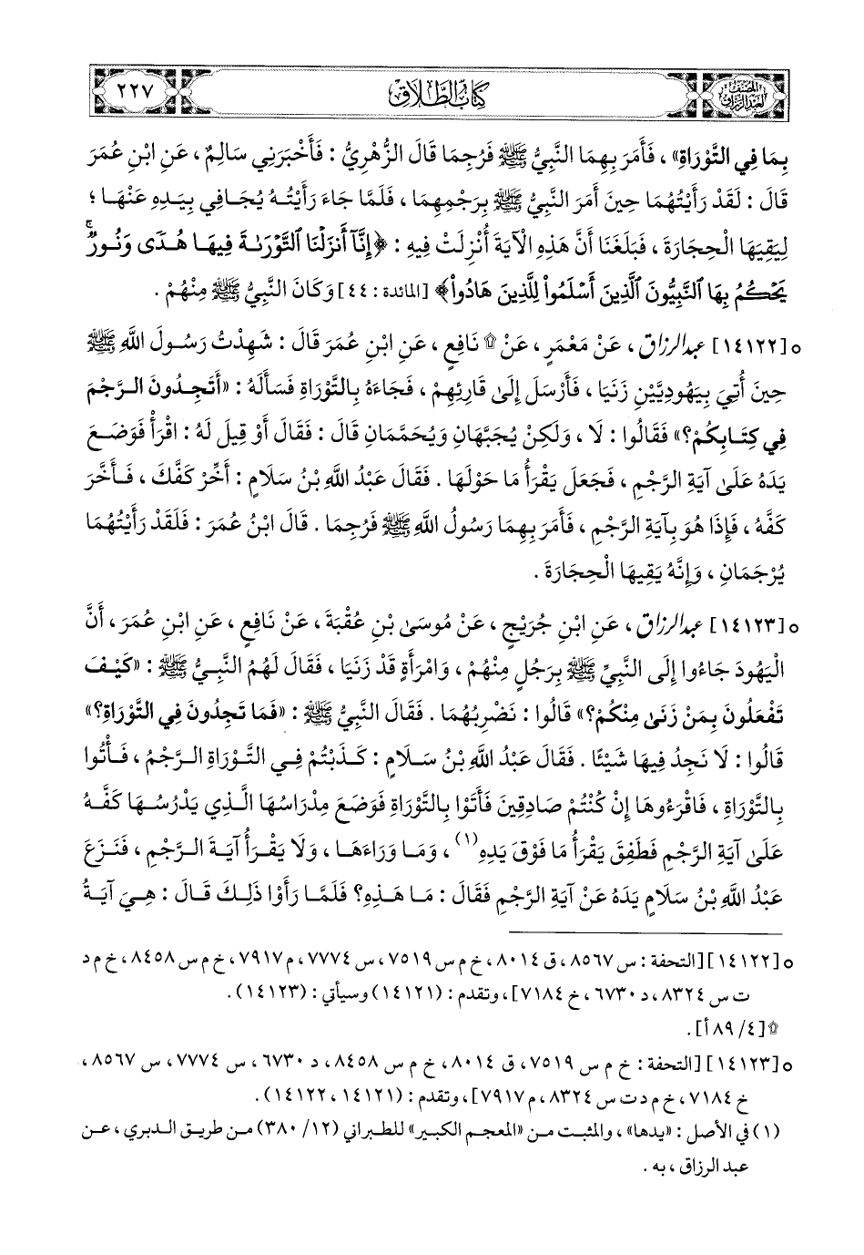14122- عبد الرزاق، عَنْ مَعْمَرٍ، عَن نَافِعٍ، عَنِ ابْنِ عُمَرَ، قَالَ: شَهِدْتُ رَسُولَ اللهِ صَلَّى اللهُ عَلَيْهِ وَسَلَّمَ حِينَ أُتِيَ بِيَهُودِيَّيْنِ زَنَيَا، فَأَرْسَلَ إِلَى قَارِئِهِمْ، فَجَاءَهُ بِالتَّوْرَاةِ، فَسَأَلَهُ: أَتَجِدُونَ الرَّجْمَ فِي كِتَابِكُمْ؟ فَقَالُوا: لاَ، وَلَكِنْ يُجَبَّهَانِ وَيُحَمَّمَانِ، قَالَ: فَقَالَ، أَوْ قِيلَ لَهُ: اقْرَأْ، فَوَضَعَ يَدَهُ عَلَى آيَةِ الرَّجْمِ، فَجَعَلَ يَقْرَأُ مَا حَوْلَهَا. فَقَالَ [له] (1) عَبدُ اللهِ بن سَلاَمٍ: أَخِّرْ كَفَّكَ، فَأَخَّرَ كَفَّهُ، فَإِذَا هُوَ بِآيَةِ الرَّجْمِ، فَأَمَرَ بِهِمَا رَسُولُ اللهِ صَلَّى اللهُ عَلَيْهِ وَسَلَّمَ فَرُجِمَا.