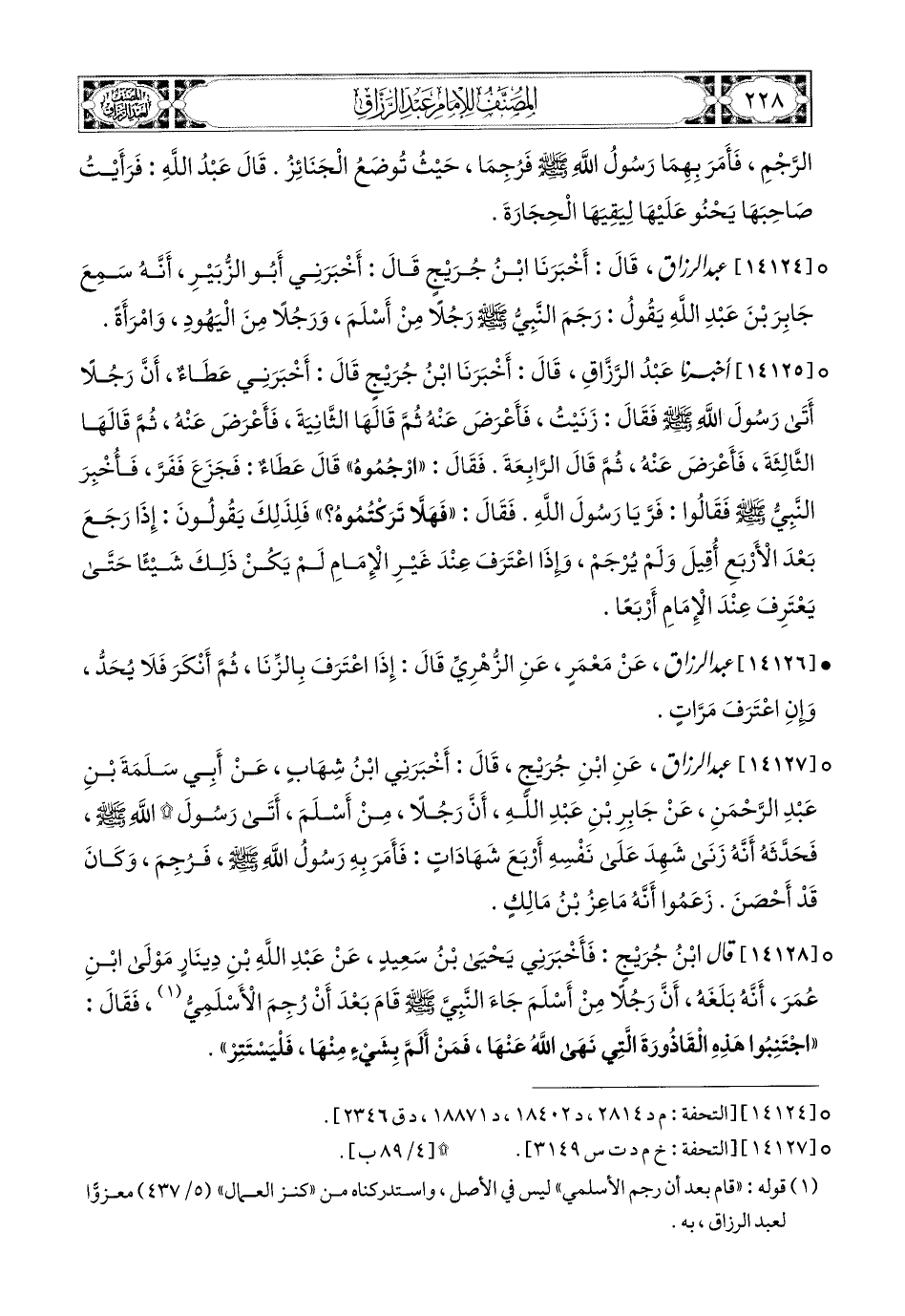14127- عبد الرزاق، عَنِ ابْنِ جُرَيْجٍ، قَالَ: أَخْبَرَنِي ابْنُ شِهَابٍ، عَنْ أَبِي سَلَمَةَ بْنِ عَبدِ الرَّحْمَنِ، عَن جَابِرِ بْنِ عَبدِ اللهِ، أَنَّ رَجُلاً مِنْ أَسْلَمَ أَتَى رَسُولَ اللهِ صَلَّى اللهُ عَلَيْهِ وَسَلَّمَ، فَحَدَّثَهُ أَنَّهُ زَنَى شَهِدَ عَلَى نَفْسِهِ أَرْبَعَ شَهَادَاتٍ، فَأَمَرَ بِهِ رَسُولُ اللهِ صَلَّى اللهُ عَلَيْهِ وَسَلَّمَ فَرُجِمَ، وَكَانَ قَدْ أَحْصَنَ. زَعَمُوا أَنَّهُ مَاعِزُ بن مَالِكٍ.
