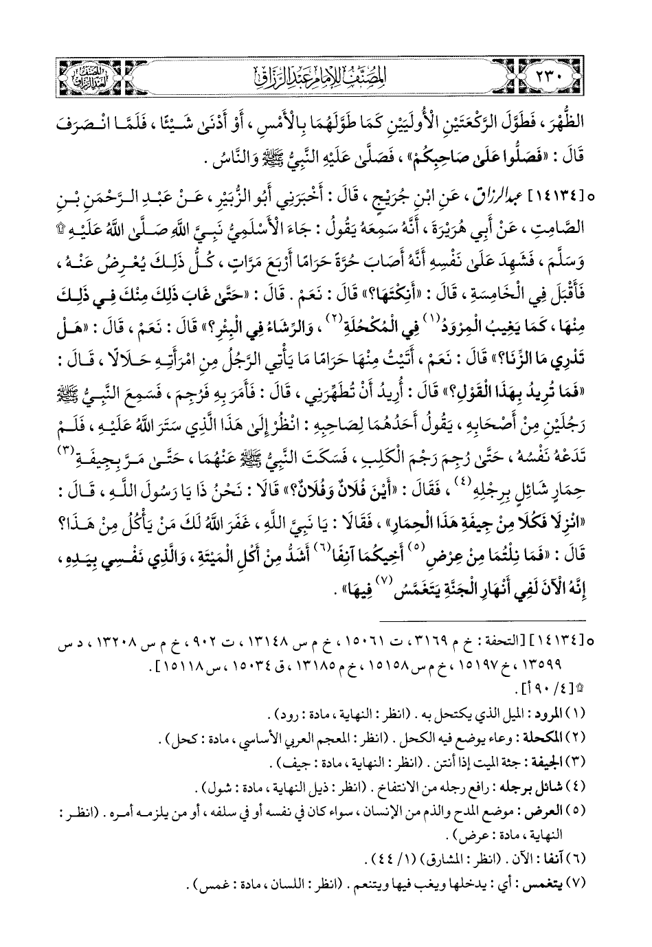 14134 - عبد الرزاق، عَنِ ابْنِ جُرَيْجٍ، قَالَ: أَخْبَرَنِي أَبو الزُّبَيْرِ، عَنْ عَبدِ الرَّحْمَنِ بْنِ الصَّامِتِ، عَنْ أَبِي هُرَيرَةَ، أَنَّهُ سَمِعَهُ يَقُولُ: جَاءَ الأَسْلَمِيُّ نَبِيَّ اللهِ صَلَّى اللهُ عَلَيْهِ وَسَلَّمَ، فَشَهِدَ عَلَى نَفْسِهِ أَنَّهُ أَصَابَ حُرَّةً حَرَامًا أَرْبَعَ مَرَّاتٍ، كُلُّ ذَلِكَ يُعْرِضُ عَنْهُ، فَأَقْبَلَ فِي الْخَامِسَةِ، قَالَ: أَنِكْتَهَا؟ قَالَ: نَعَمْ. قَالَ: حَتَّى غَابَ ذَلِكَ مِنْكَ فِي ذَلِكَ مِنْهَا، كَمَا يَغِيبُ المِرْوَدُ فِي المُكْحُلَةِ، وَالرِّشَاءُ فِي الْبِئْرِ؟ قَالَ: نَعَمْ. قَالَ: هَلْ تَدْرِي مَا الزِّنَا؟ قَالَ: نَعَمْ. أَتَيْتُ مِنْهَا حَرَامًا مَا يَأْتِي الرَّجُلُ مِنِ امْرَأَتِهِ حَلاَلاً، قَالَ: فَمَا تُرِيدُ بِهَذَا الْقَوْلِ؟ قَالَ: أُرِيدُ أَنْ تَطَهِّرَنِي. قَالَ: فَأَمَرَ بِهِ فَرُجِمَ، فَسَمِعَ النَّبِيُّ صَلَّى اللهُ عَلَيْهِ وَسَلَّمَ رَجُلَيْنِ مِنْ أَصْحَابِهِ، يَقُولُ أَحَدُهُمَا لِصَاحِبِهِ: انْظُرْ إِلَى هَذَا الَّذِي سَتَرَ اللهُ عَلَيْهِ، فَلَمْ تَدَعْهُ نَفْسُهُ، حَتَّى رُجِمَ رَجْمَ الْكَلِبِ، فَسَكَتَ النَّبِيُّ صَلَّى اللهُ عَلَيْهِ وَسَلَّمَ عَنْهُمَا، حَتَّى مَرَّ بِجِيفَةِ حِمَارٍ شَائِلٍ بِرِجْلِهِ، فَقَالَ: أَيْنَ فُلاَنٌ وَفُلاَنٌ؟ قَالا (1): نَحْنُ ذَا يَا رَسُولَ اللهِ، قَالَ: انْزِلاَ فَكُلاَ مِنْ جِيفَةِ هَذَا الْحِمَارِ. فَقَالاَ: يَا نَبِيَّ اللهِ، غَفَرَ اللهُ لَكَ، مَنْ يَأكُلُ مِنْ هَذَا؟ قَالَ: فَمَا نِلْتُمَا مِنْ عِرْضِ أَخِيكُمَا آنِفًا أَشَدُّ مِنْ أَكْلِ المَيْتَةِ، وَالَّذِي نَفْسِي بِيَدِهِ، إِنَّهُ الآنَ لَفِي أَنْهَارِ الْجَنَّةِ، يَتَغَمَّسُ فِيهَا.