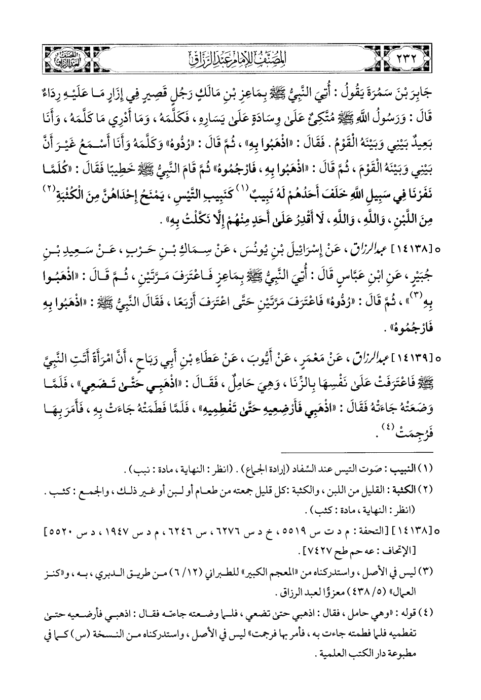 14138- عبد الرزاق، عَن إِسْرَائِيلَ بْنِ يُونُسَ، عَن سِمَاكِ بْنِ حَرْبٍ، عَن سَعيدِ بْنِ جُبَيرٍ، عَنِ ابْنِ عَبَّاسٍ، قَالَ: أُتِيَ النَّبِيُّ صَلَّى اللهُ عَلَيْهِ وَسَلَّمَ بِمَاعِزٍ، فَاعْتَرَفَ مَرَّتَيْنِ، ثُمَّ قَالَ: اذْهَبُوا بِهِ، ثُمَّ قَالَ: رُدُّوهُ، فَاعْتَرَفَ مَرَّتَيْنِ، حَتَّى اعْتَرَفَ أَرْبَعًا، فَقَالَ النَّبِيُّ صَلَّى اللهُ عَلَيْهِ وَسَلَّمَ: اذْهَبُوا بِهِ فَارْجُمُوهُ.