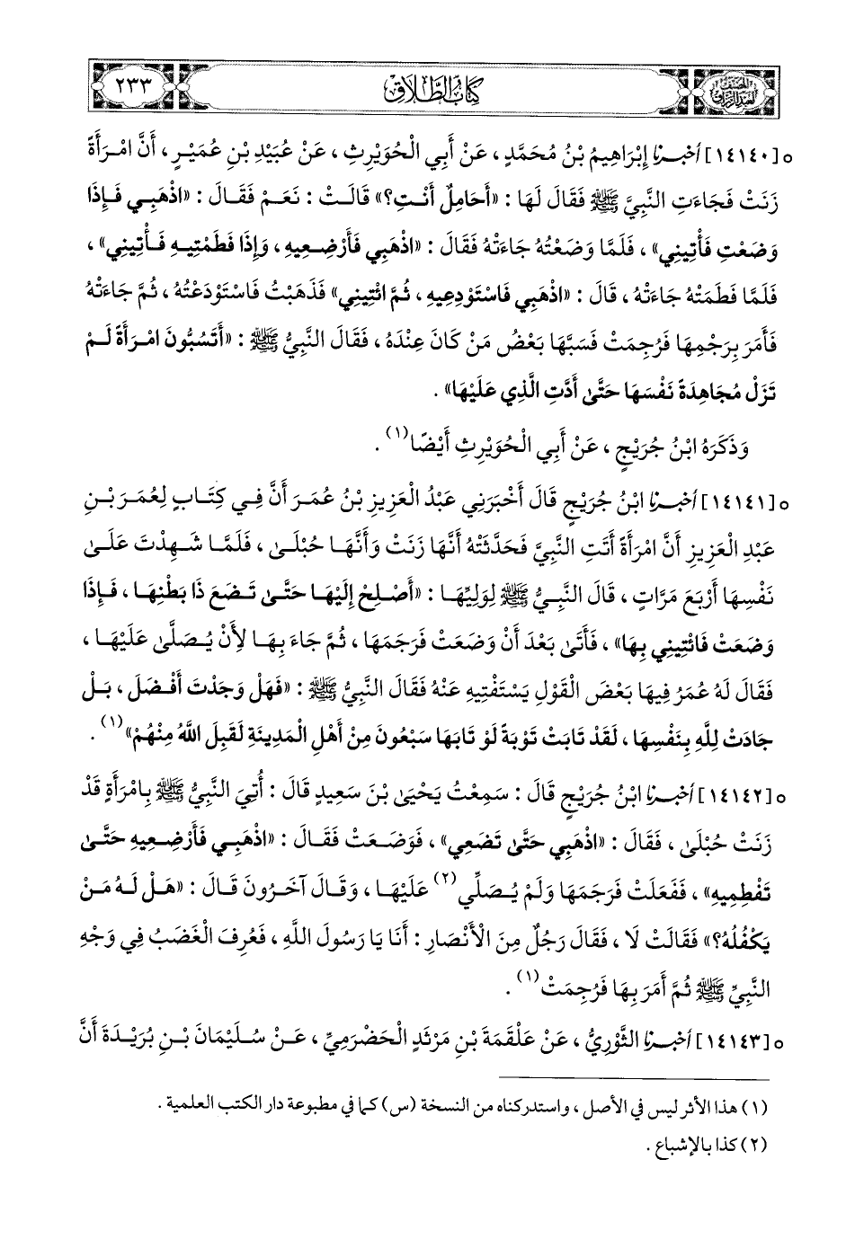 14140- أَخْبَرَنَا إِبْرَاهِيمُ بْنُ مُحَمَّدٍ، عَنْ أَبِي الْحُوَيْرِثِ، عَنْ عُبَيْدِ بْنِ عُمَيْرٍ: أَنَّ امْرَأَةً زَنَتْ، فَجَاءَتِ النَّبِيَّ صَلَّى اللهُ عَلَيْهِ وَسَلَّمَ، فَقَالَ لَهَا: أحاملٌ أنت؟ قَالَتْ: نَعَمْ، فَقَالَ: اذْهَبِي، فَإِذَا وضعت فائتيني، فَلَمَّا وضعته جاءته، فَقَالَ: اذْهَبِي فَأَرْضِعِيهِ، وَإِذَا فطمتيه فأتيني، فَلَمَّا فطمته جاءته، قَالَ: اذْهَبِي، فاستودعيه، ثُمَّ ائتيني، فذهبت، فاستودعته، ثُمَّ جاءته، فأمر بِهَا فرجمت، فسبها بعض مَنْ كَانَ عنده، فَقَالَ النَّبِيُّ صَلَّى اللهُ عَلَيْهِ وَسَلَّمَ: أتسبون امرأة لم تزل مجاهدة نفسها، حَتَّى أدت الذى عليها.