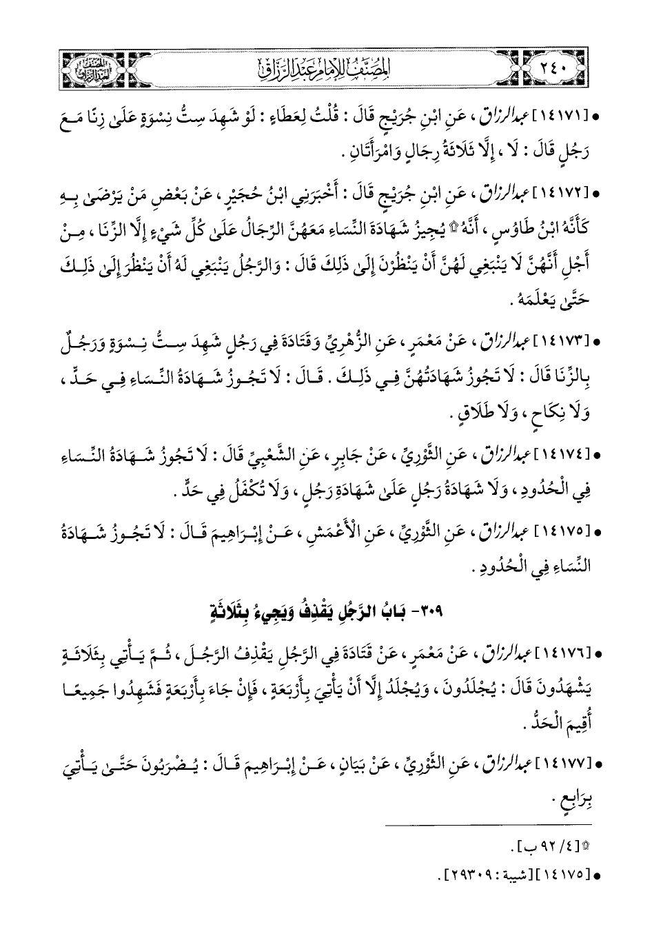 14176- عبد الرزاق، عَنْ مَعْمَرٍ، عَن قَتَادَةَ، فِي الرَّجُلِ يَقْذِفُ الرَّجُلَ، ثُمَّ يَأْتِي بِثَلاَثَةٍ يَشْهَدُونَ، قَالَ: يُجْلَدُونَ، وَيُجْلَدُ، إِلاَّ أَنْ يَأْتِيَ بِأَرْبَعَةٍ، فَإِنْ جَاءَ بِأَرْبَعَةٍ، فَشَهِدُوا جَمِيعًا أُقِيمَ الْحَدُّ.