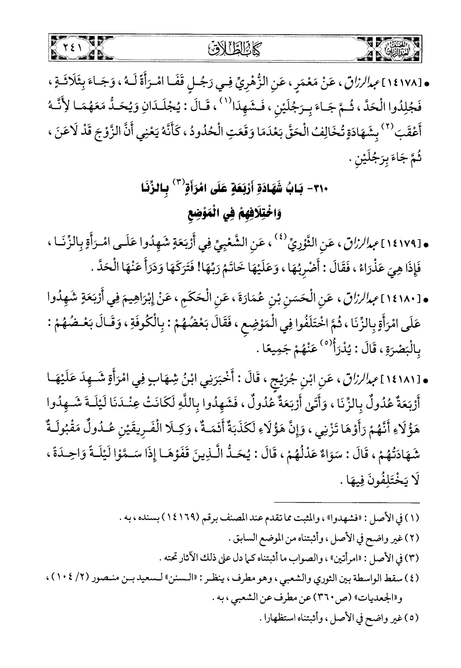 14179 - عبد الرزاق، عَنِ الثَّورِيِّ، [عَنْ مُطَرِّف] (2) عَنِ الشَّعْبِيِّ، فِي أَرْبَعَةِ شُهَدَاءَ عَلَى امْرَأَةٍ بِالزِّنَا، فَإِذَا هِيَ عَذْرَاءُ، فَقَالَ: أَضْرِبُهَا، وَعَلَيْهَا خَاتَمُ رَبِّهَا، فَتَرَكَهَا، وَدَرَأَ عَنْهَا الْحَدَّ.