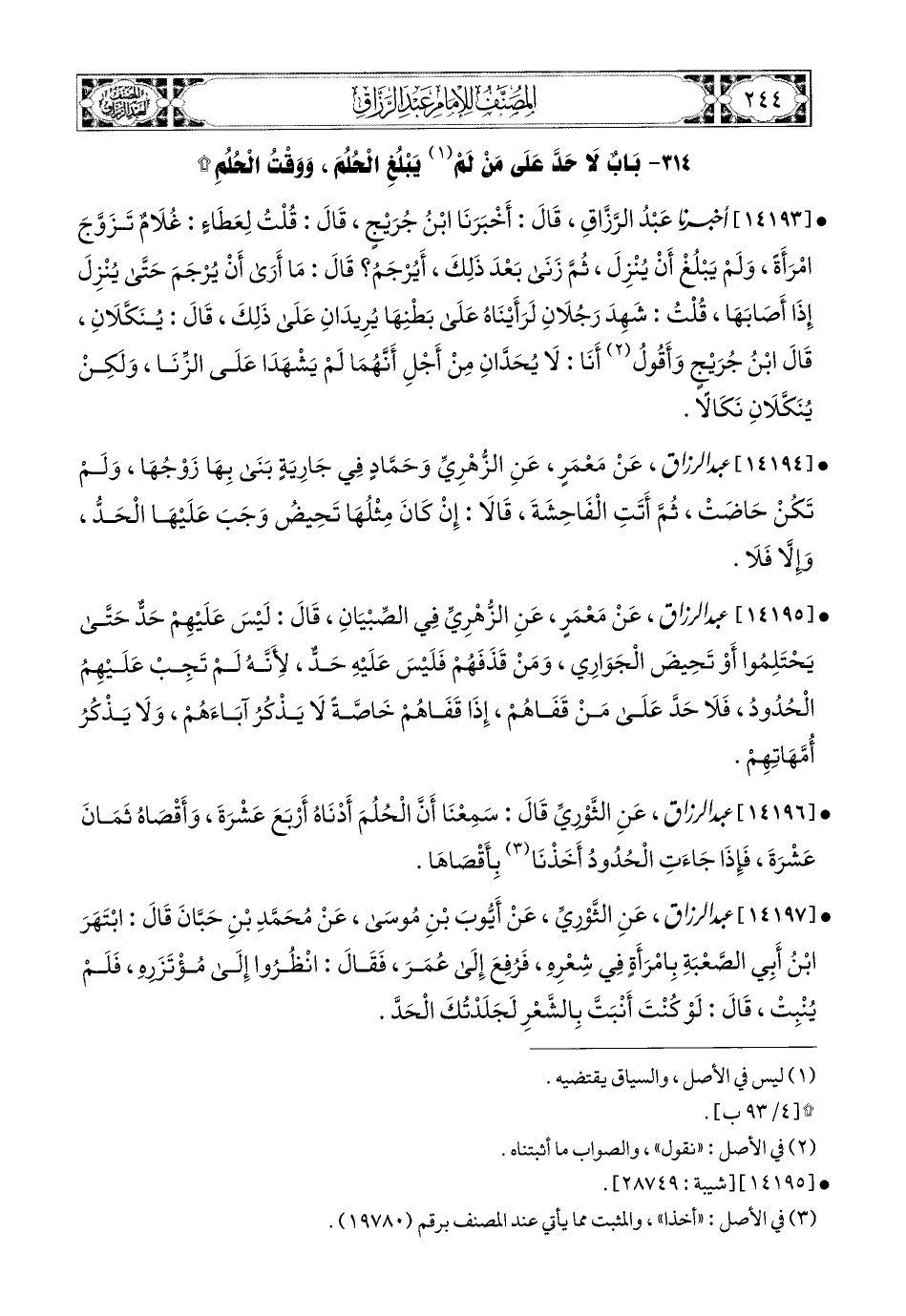 14196 - عبد الرزاق، عَنِ الثَّورِيِّ قَالَ: سَمِعْنَا أَنَّ الْحُلُمَ أَدْنَاهُ أَرْبَعَ عَشْرَةَ، وَأَقْصَاهُ ثَمَانِ عَشْرَةَ، فَإِذَا جَاءَتِ الْحُدُودُ، أَخَذْنَا بِأَقْصَاهَا (1).
